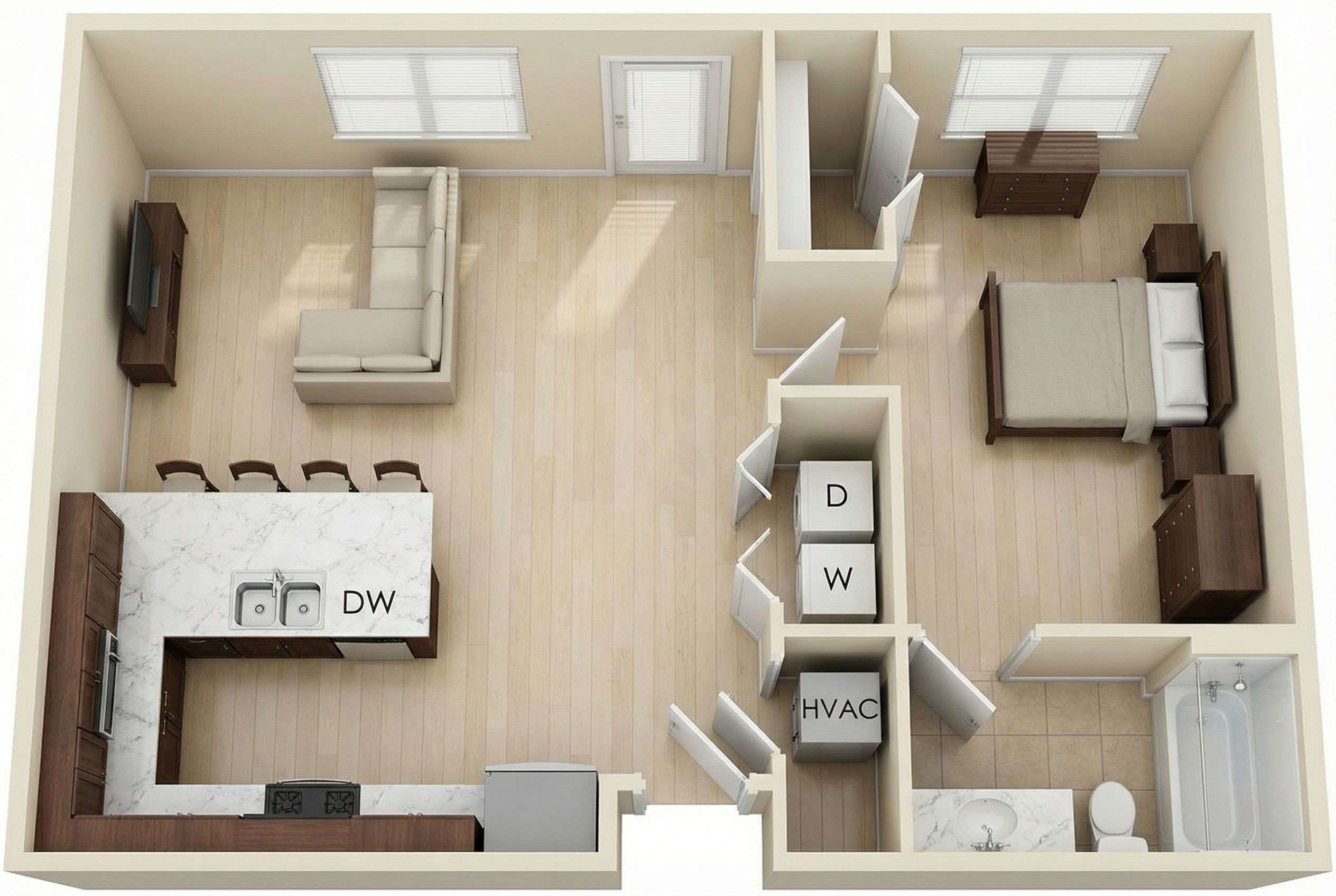 make image photorealistic add books and plants on coffee table add doors make window more realistic floors are wood planks add ceiling