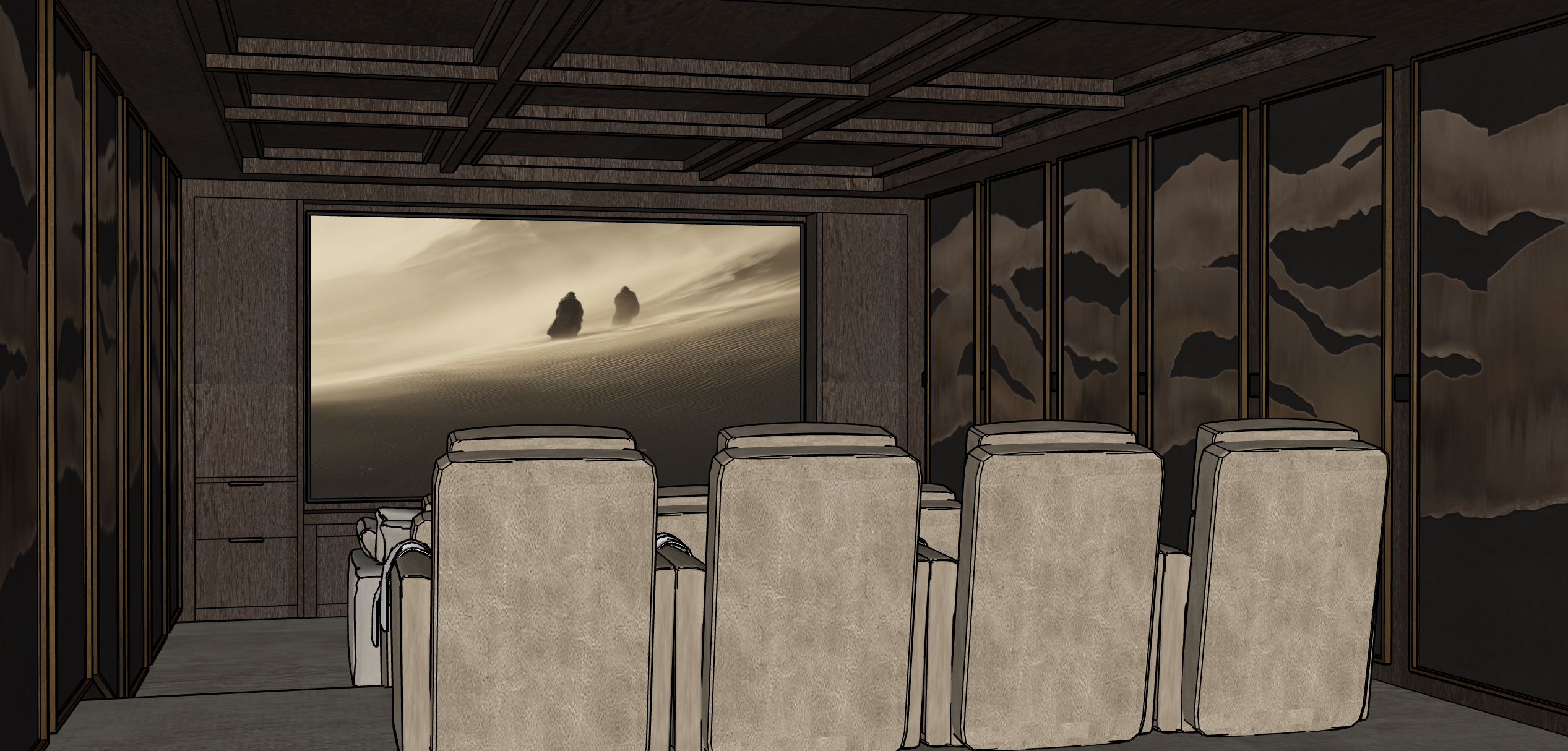 lighting atmosphere overall style hyper realistic 3d visualization with photorealistic quality wall sconce lighting the sconces cast a soft cone shaped light both upward and downward on the wall surface behind the floating panels the light beam is narrow near the fixture and gradually widens as it moves away even when the sconces themselves are hidden behind the panels the light they emit should still be visible on the wall led strips behind screen very dim led strip lighting behind the screen at 10 brightness color temperature all artificial lighting must be 3000k warm light general lighting maintain realistic lighting direction shadow softness and natural interior light behaviour