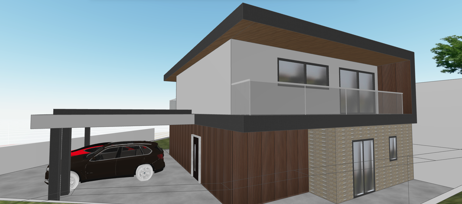 exterior shot render a modern two story house with a sleek minimalist design the upper section is white with large glass windows complemented by a dark gray trim the lower section features light brown wood paneling and beige stonework a black car with a glossy finish sits in a concrete driveway partially covered by a gray carport the atmosphere is bright and airy with a clear blue sky conveying a calm and inviting suburban feel add a tree with lush green leaves in the background for a touch of nature architecture