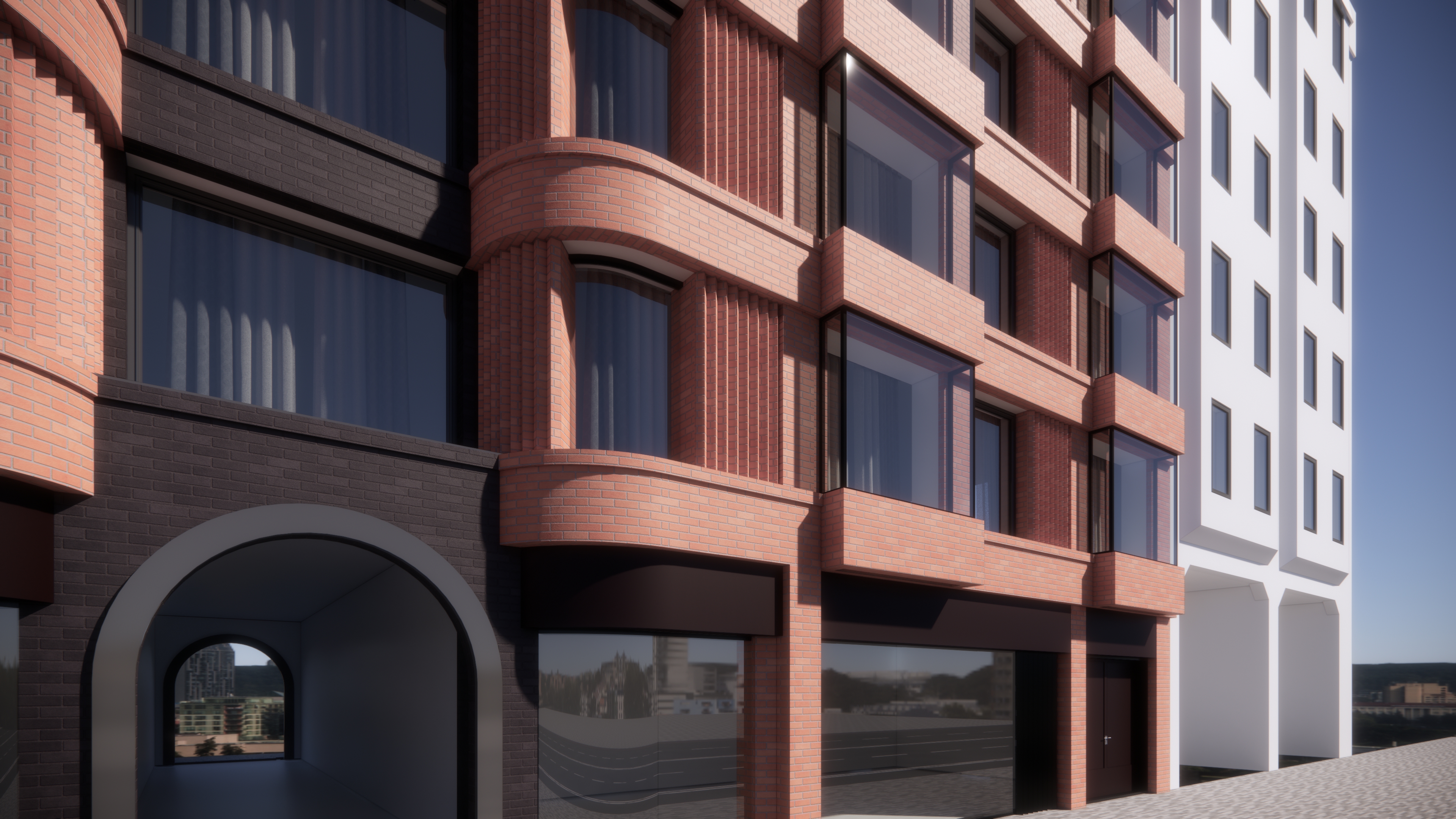 please enhance this image boosted window contrast and reflection street details with pedestrians and subtle improve brick material details upscale the image to hd do not change the geometry