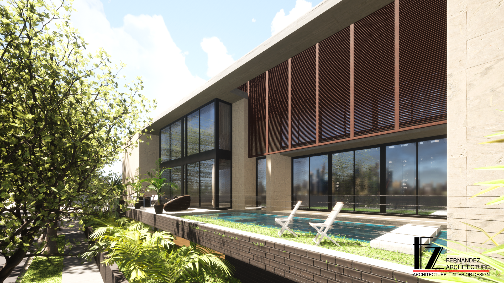 elimina el logo respeta la perspectiva el fondo pertenece a un espacio de una planta por debajo donde se situa el salon esta habitaci n se separa del espacio de abajo a la altura de las cortinas por una pared de vidrio de suelo a techo coloca la cama mirando al fondo y coloca plantas tropicales en el patio exterior esto es una vista desde el primer piso elimina el fondo por que es un doble espacio del sal n