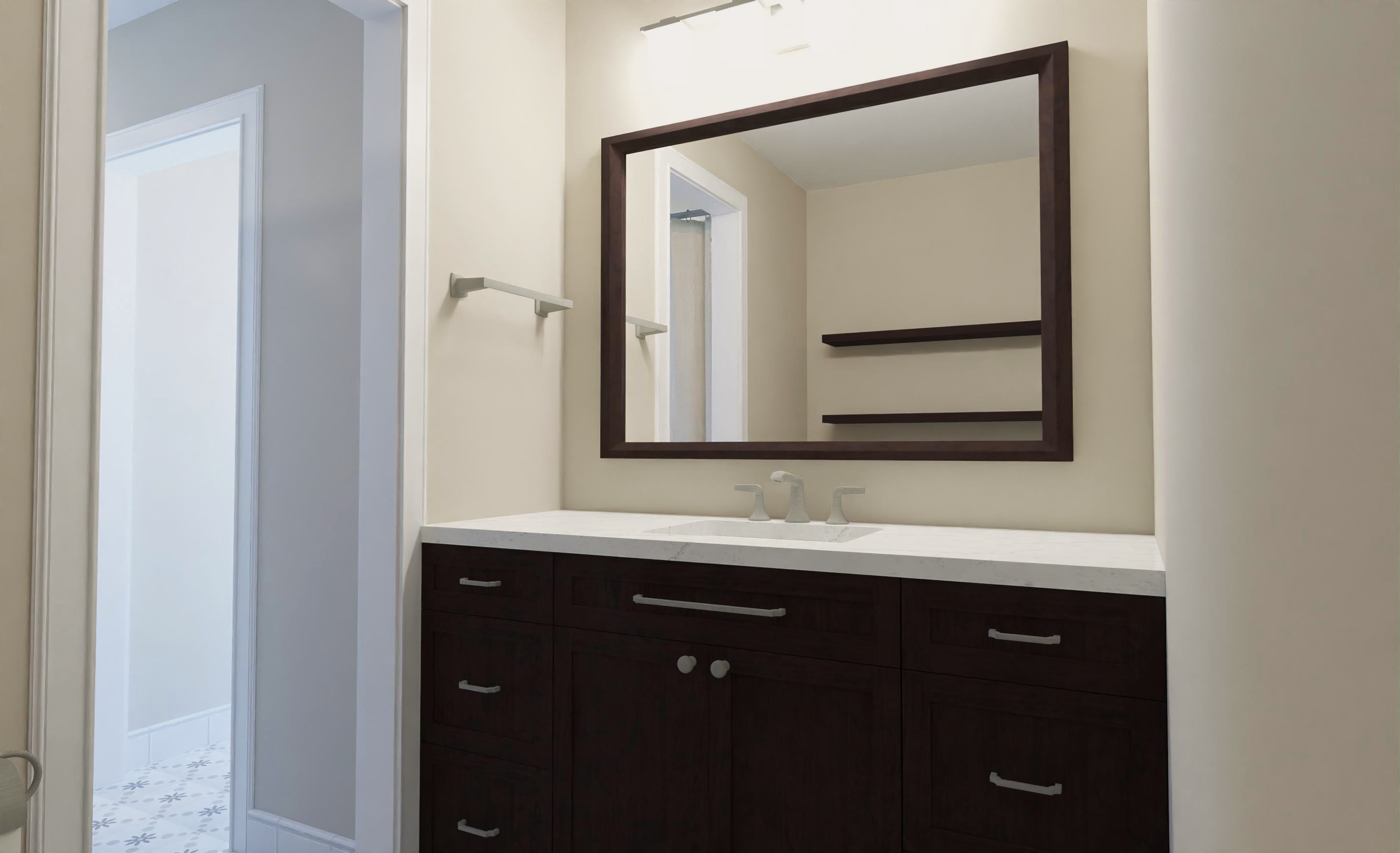 accessorize this bathroom and dim the lights do not add lights below floating shelves do not add lights below floating shelves do not add new fixtures or change finishes
