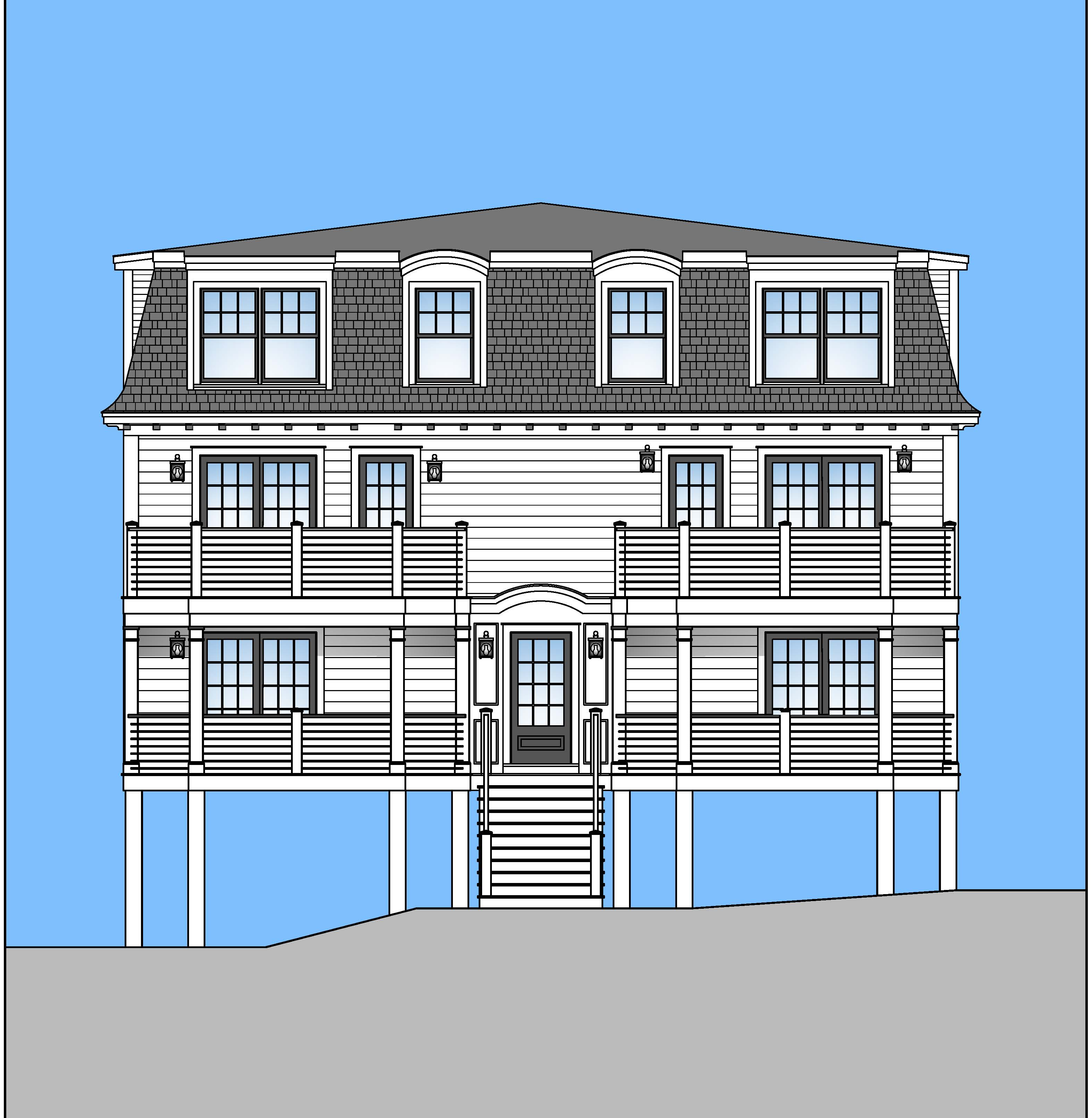 white siding black steel pilings black windows and doors horizontal wire railings beach landscape white deck columns