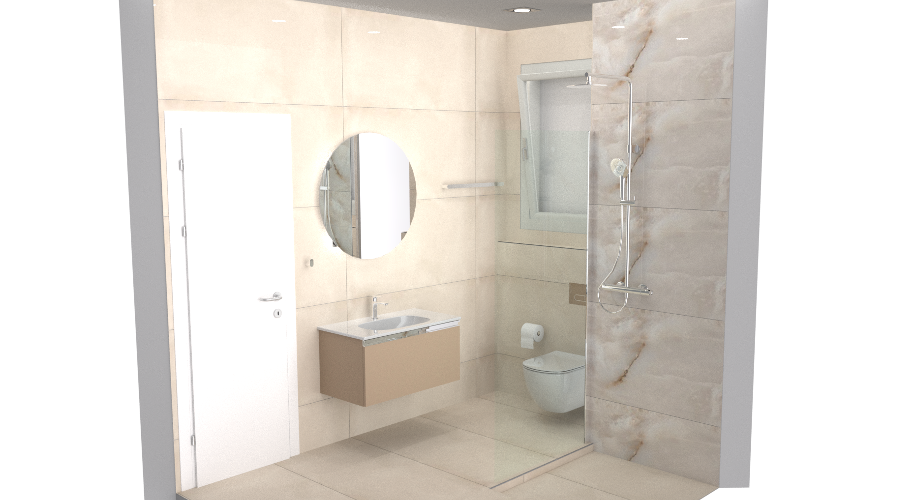 make the surfaces more mat not polished add hidden lighting behind the mirror do not change anything else