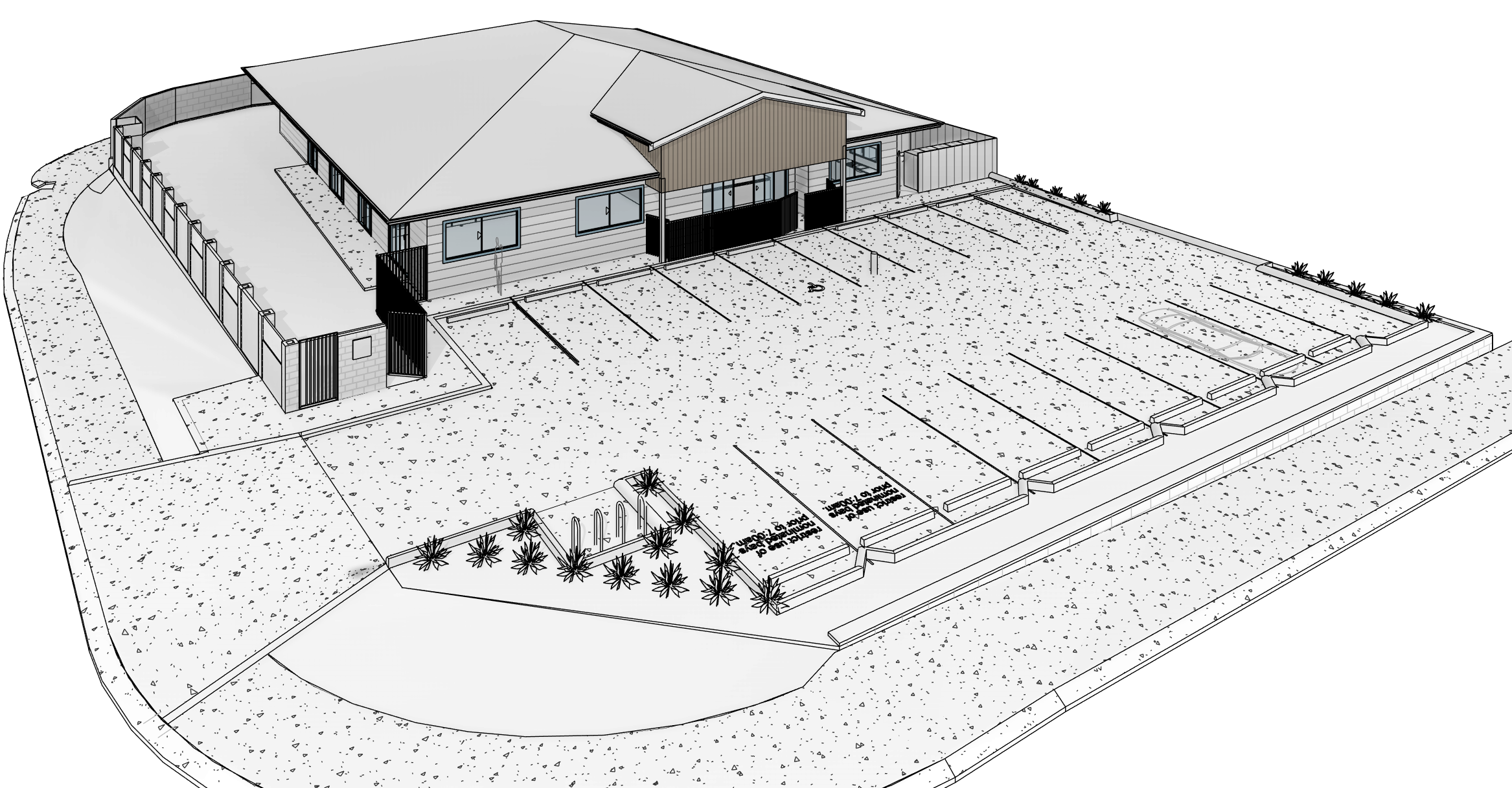 change the parking to bitumen change the vertical cladding to black change the horizontal cladding to white add road around