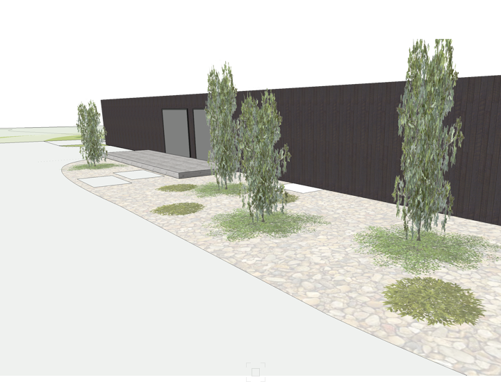add a steel roof to the house a person walking on the deck at new zealand native planting grasses and white flowering plants like guara fine pebble garden
