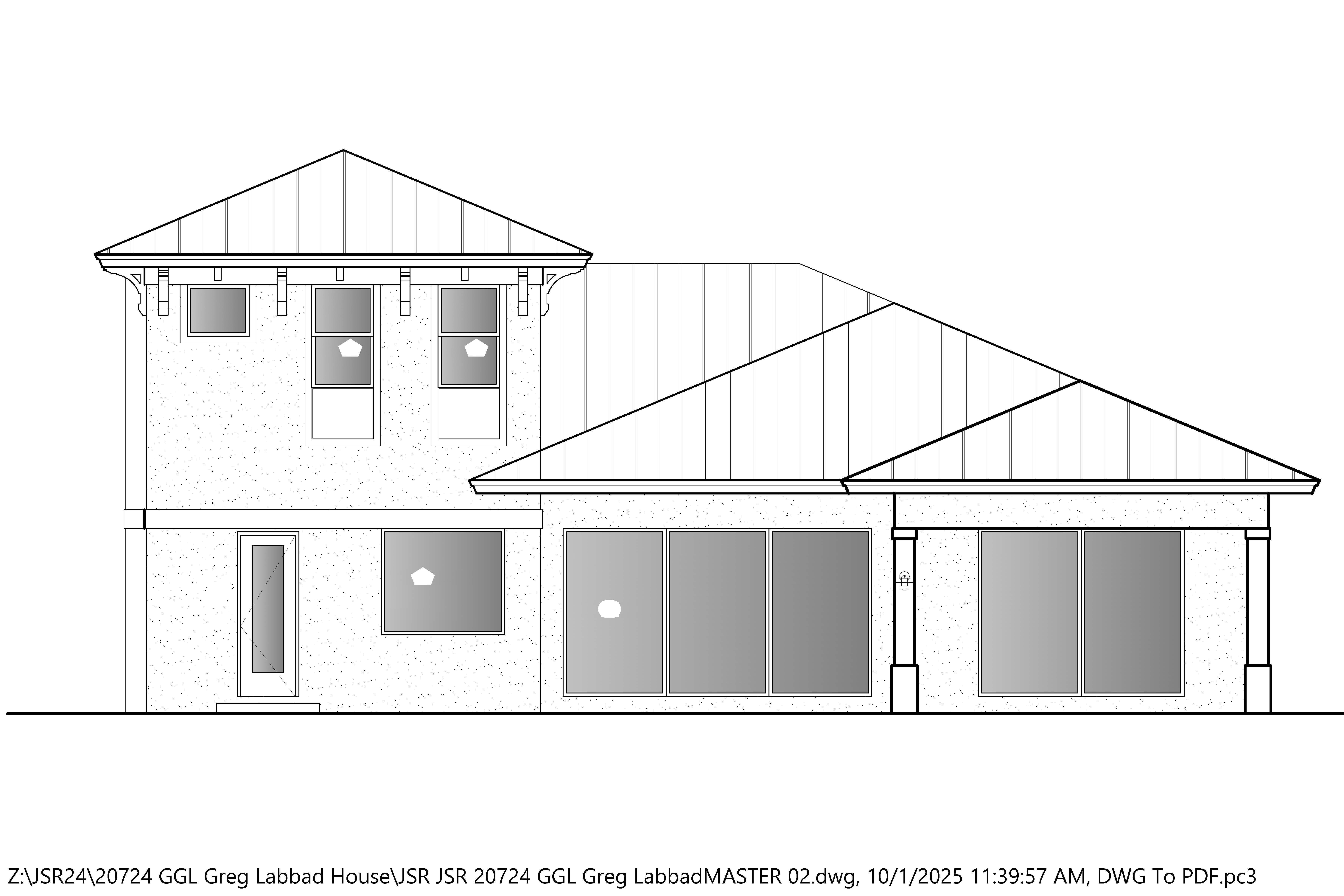 exterior shot photorealistic picture of the pool deck of a coastal home with silver metal roof white frame windows white wood brackets blue sky with white clouds and sunny day