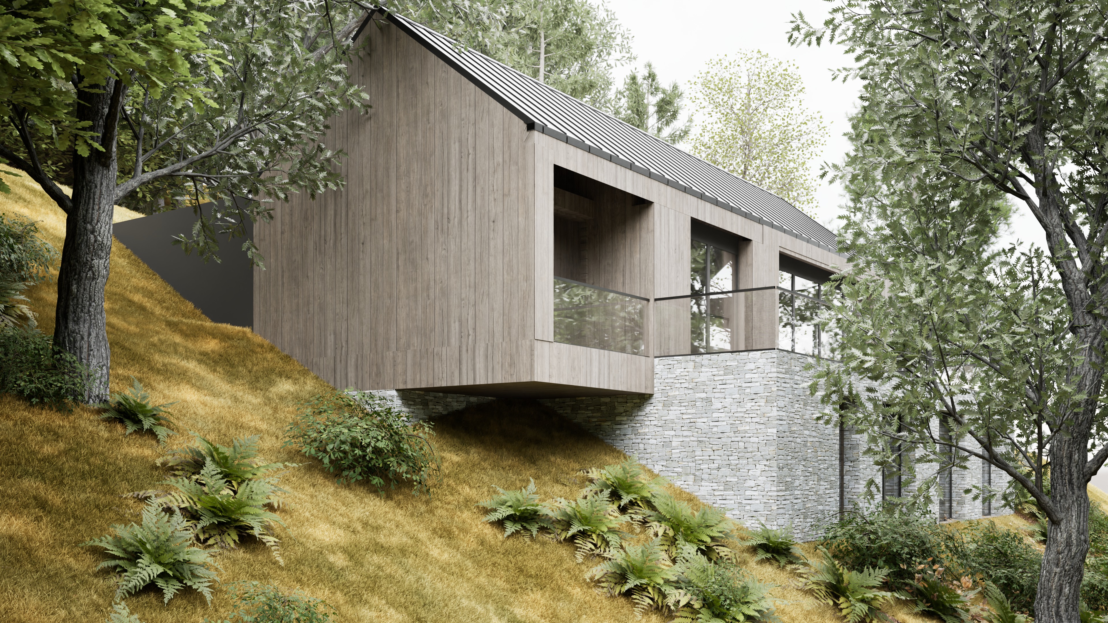 a modern hillside house with a sleek minimalist design the upper structure features dark gray rectangular supports and large glass panels for windows capturing the natural light the walls have a wooden texture with a rich warm brown color the lower half of the house is constructed from light gray stone bricks offering a rustic feel surrounding the house are lush green trees and vibrant ferns creating a serene and natural setting a gently sloping grassy hill in muted earth tones adds a touch of tranquility and harmony with the afternoon sun casting soft diffused shadows enhancing the peaceful intimate atmosphere makte ultrarealistic render with little bit more dull lights and a little fog make the wood color grey brown little bit older planks the windows should be less see through and the stone should be litttle darker