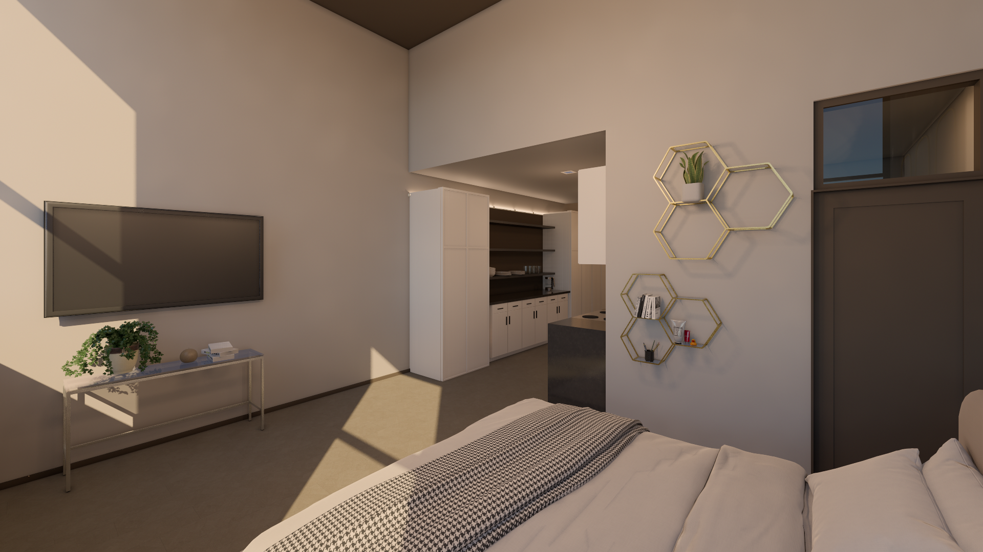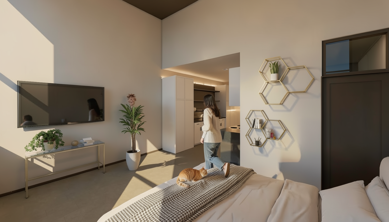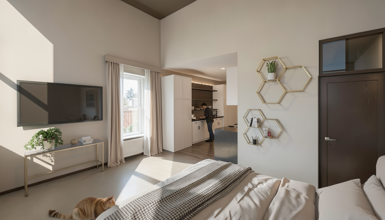 high end apartment with a man and a cat