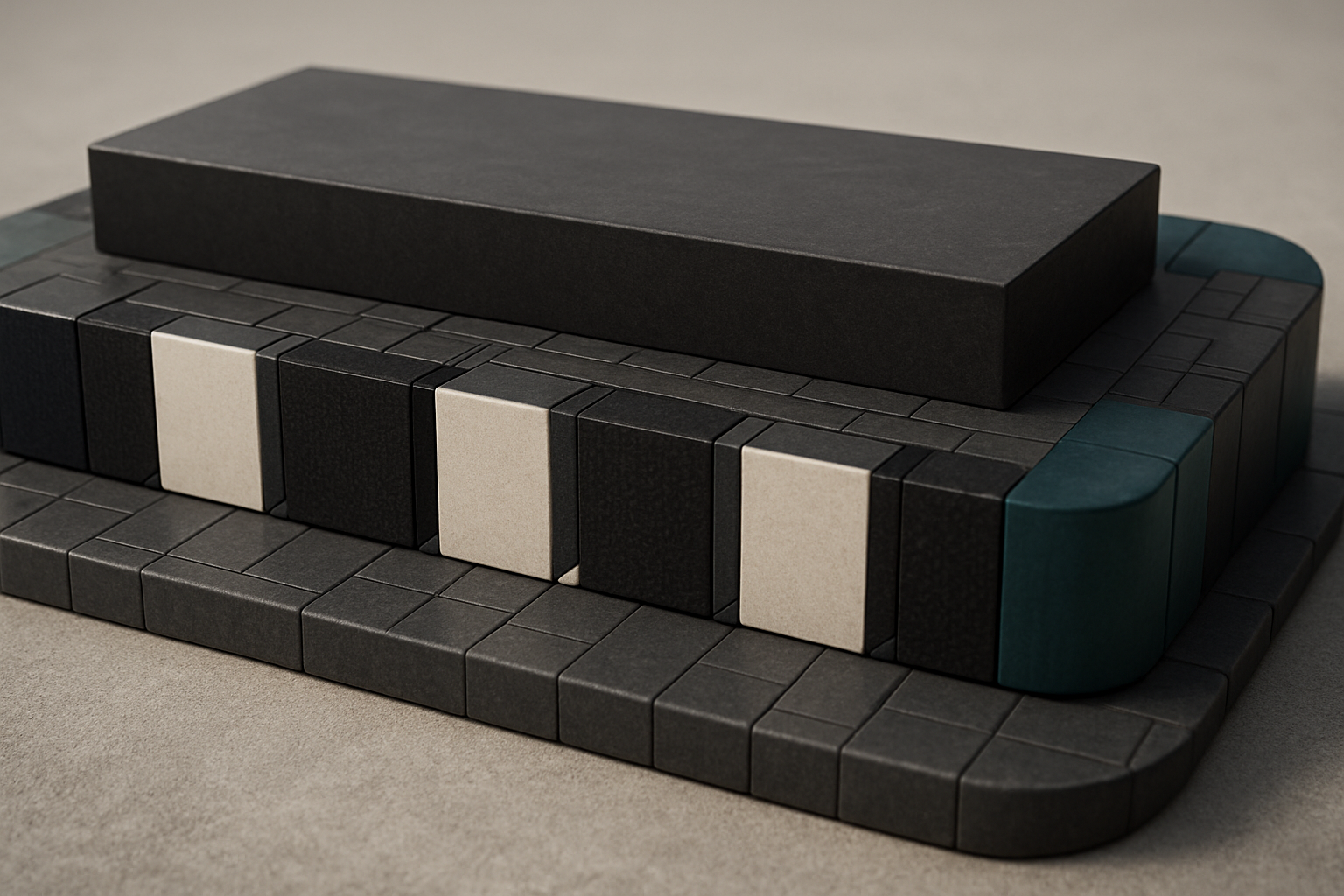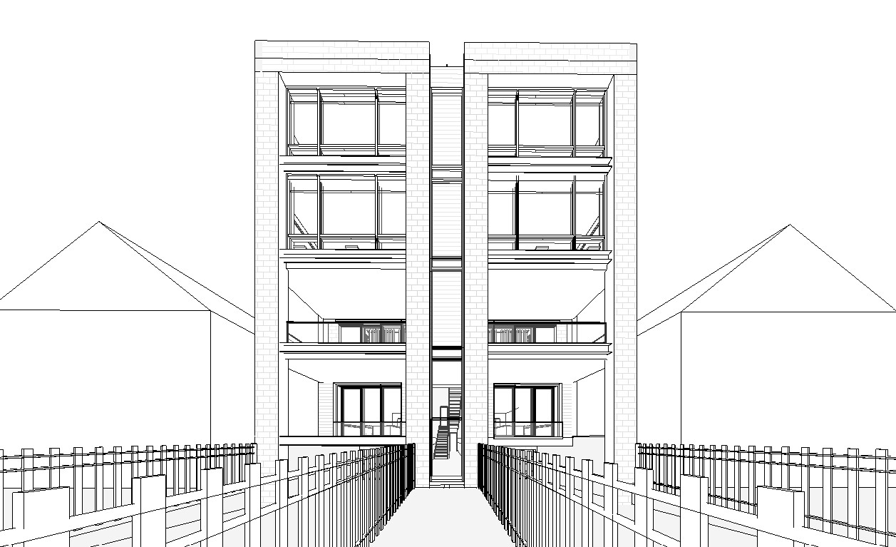 render this view grey stone siding in the middle part add some light in interior sunny day add black mullion between floors add some greens on balcony add people walking into the building from middle entry and car coming out from garage same logic to this angle