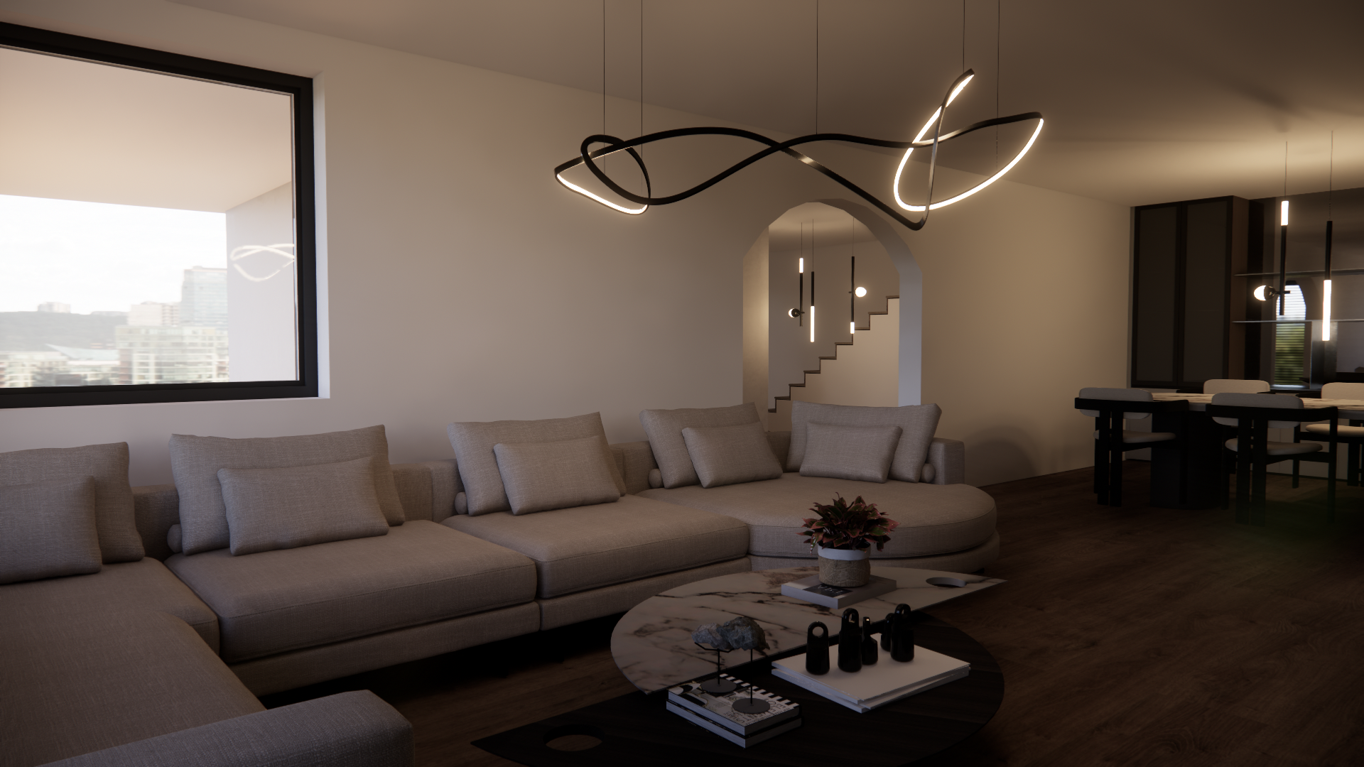 photorealistic postproduction for a modern minimalist living room soft neutral colors natural daylight light oak wood textures enhanced soft shadows balanced exposure calm and airy atmosphere