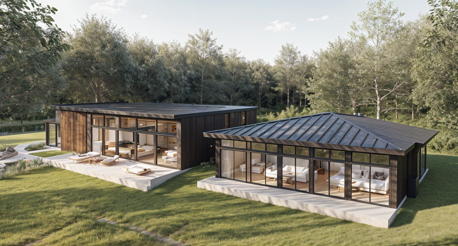render with a light earth tone cultured stone stone sill black window trim and roof fascia board dark walnut vertical ship lap siding and charcoal color asphalt roofing show bushes and grass in front and tree line in rear show front entry door roof out 10 feet as a hip set and all front roofs show as hips show front entry column bases in stone with 16 inch wood columns
