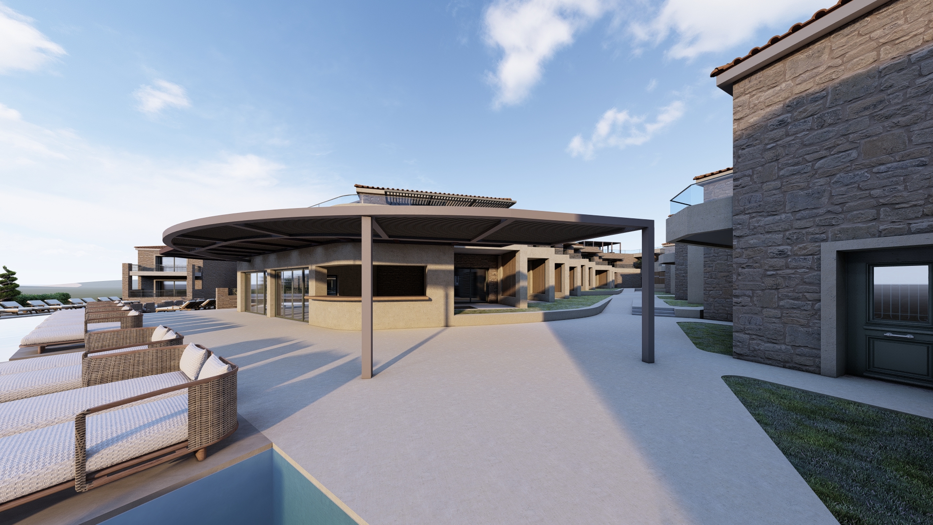 put outdoor bar furinture luxury hotel resort keep materials as it is metallic pergola
