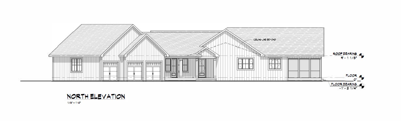 a modern rustic lodge ranch style home with stacked stone pony walls on the exterior with vertical board and batten siding at the top half of the wall large transparent glass windows with black trims enhance the design include a lush green lawn in front with flower beds of vibrant red and yellow flowers the sky is a clear bright blue with a few fluffy white clouds creating a serene and inviting atmosphere architecture