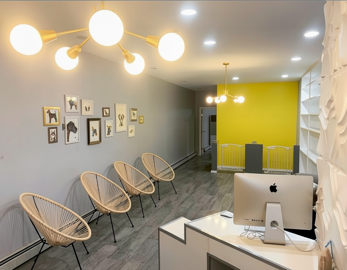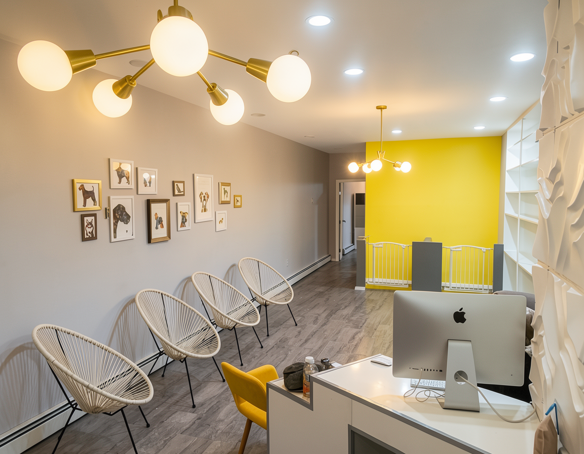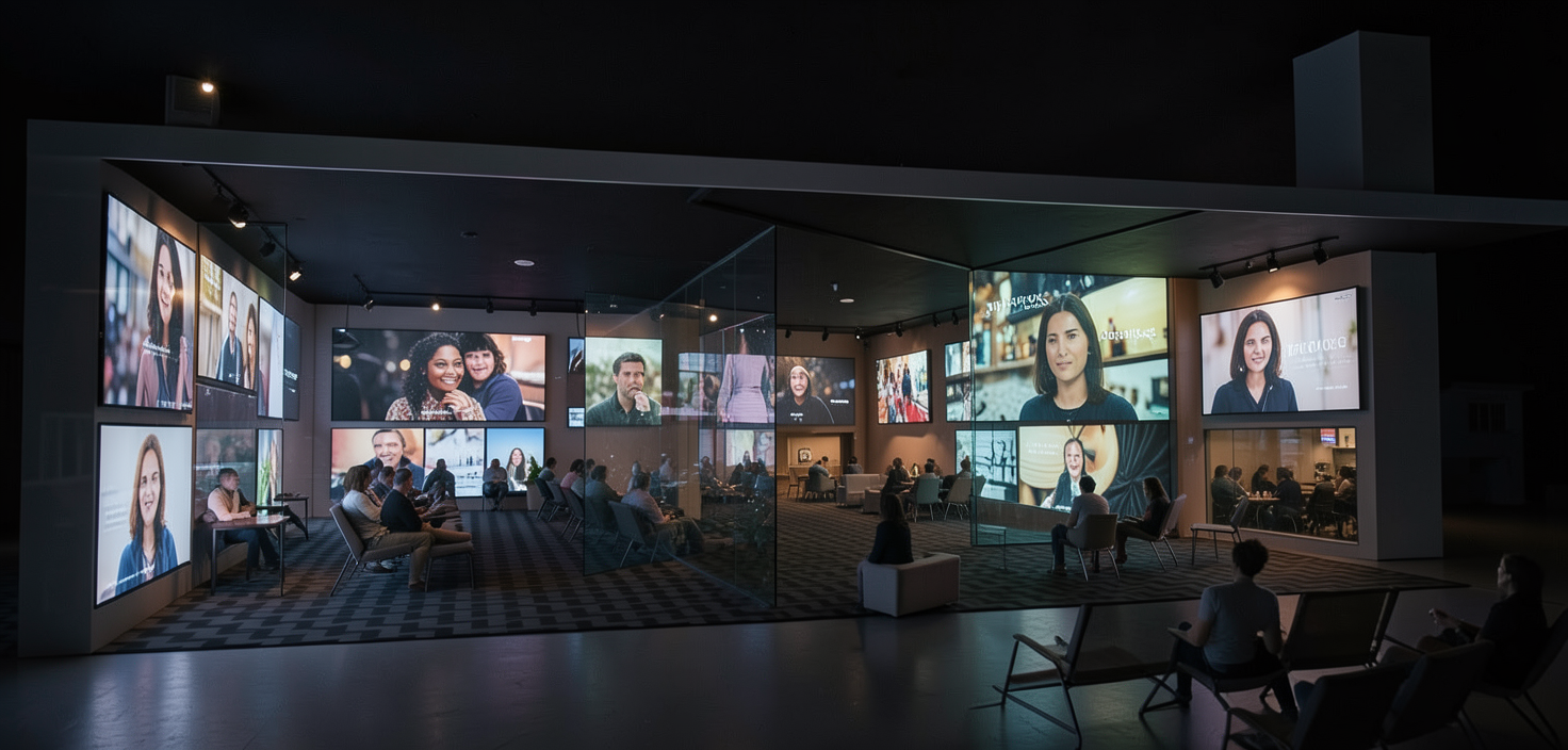 interior wtih multilple layered multized random screen wall video displays staggered different sizes and lighting for personality portraits and stories and theatre row seating dark lighting enclosed glass room portable seating in screen area small divided seating areas no seats w people in glass areas only less people more stage lighting