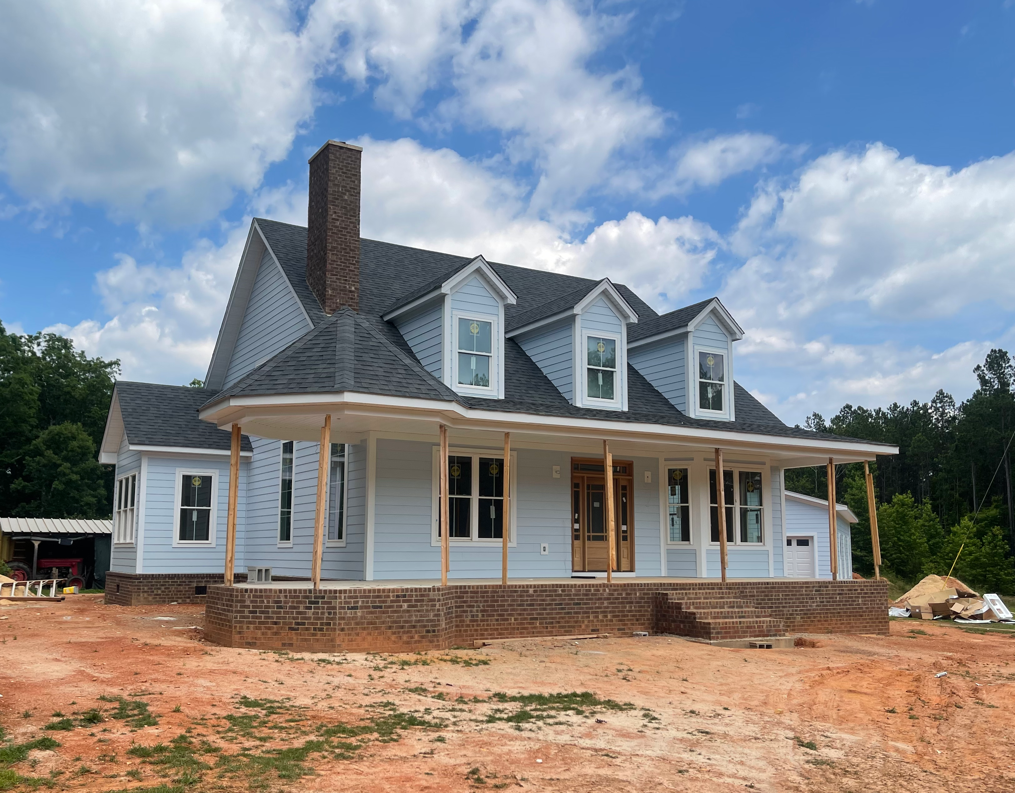 add stained wood porch columns and a white railing add lawn and landscaping