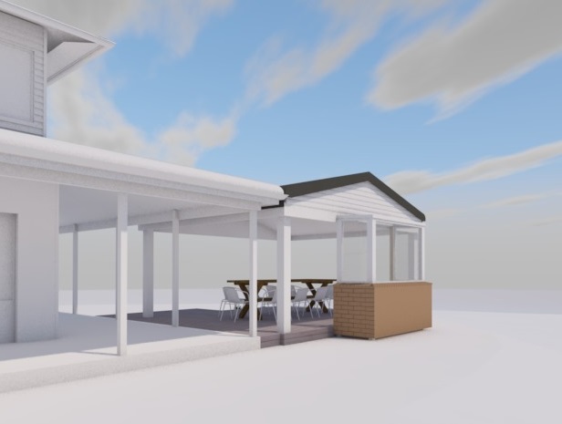 gardens around the outdoor canopy keep original building white show brick veneer on bbq units