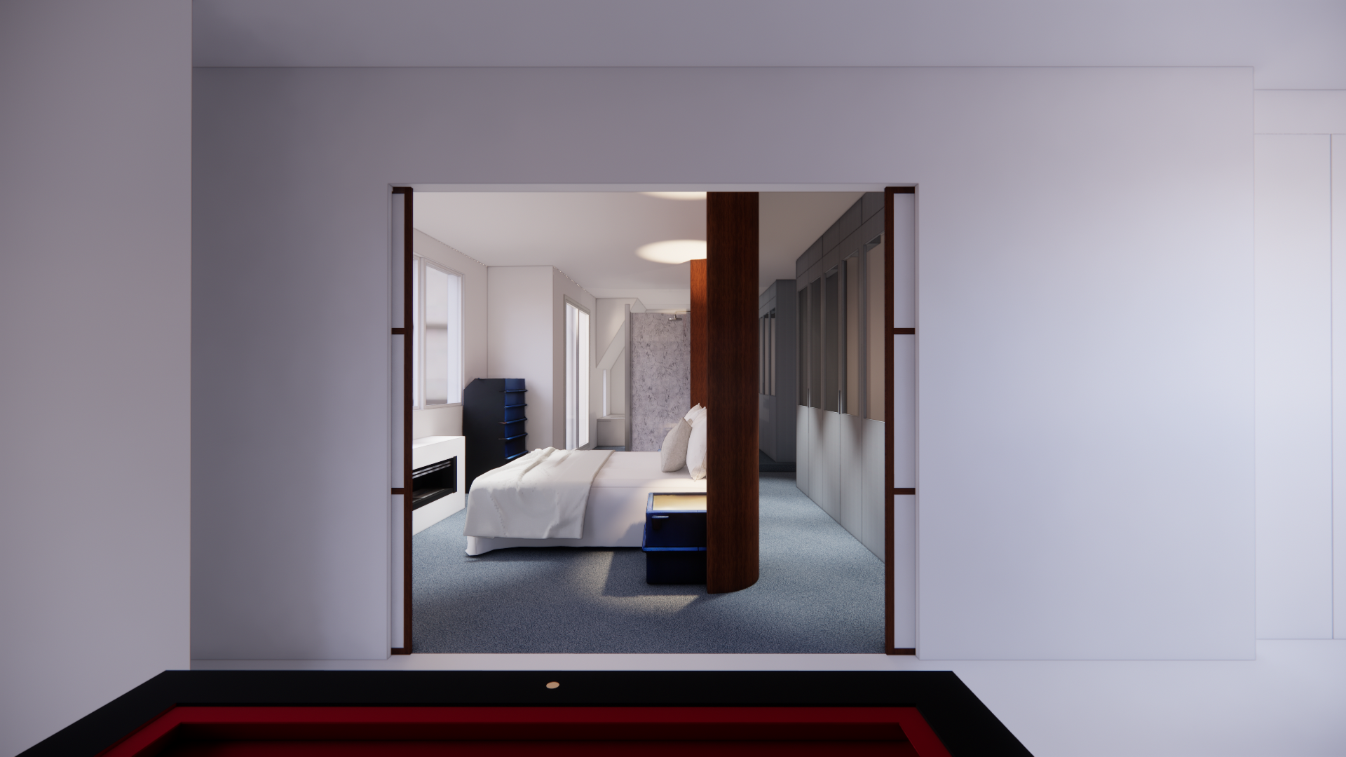 behind the glass surfaces of the furniture on the right side along the full length there are visible clothes and warm internal lighting add white linen roman blinds along the window turn on the wall sconce light