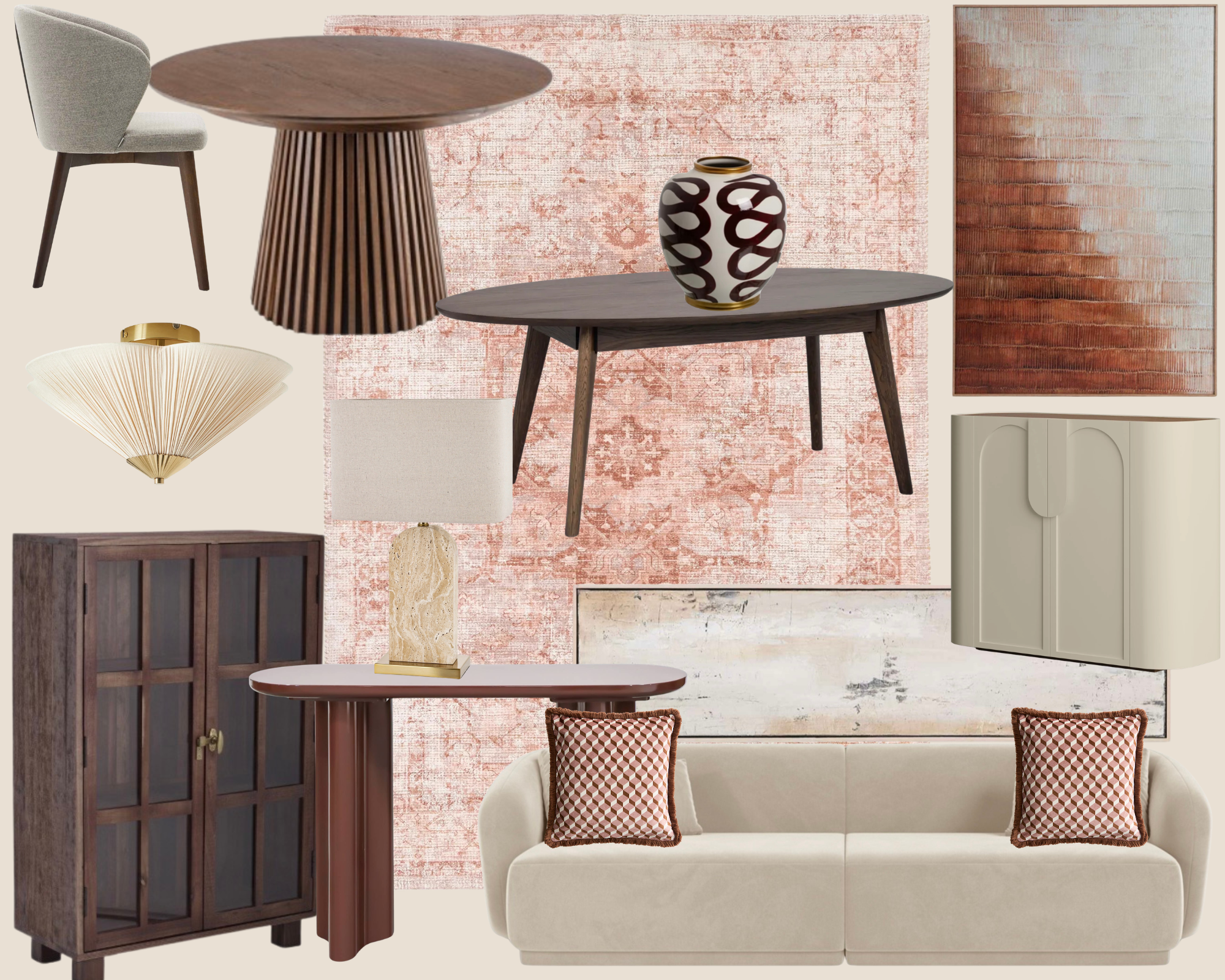 create a room in the style using colors and furniture from this moodboard gold accents dark walnut floor natural light photorealistic 8k