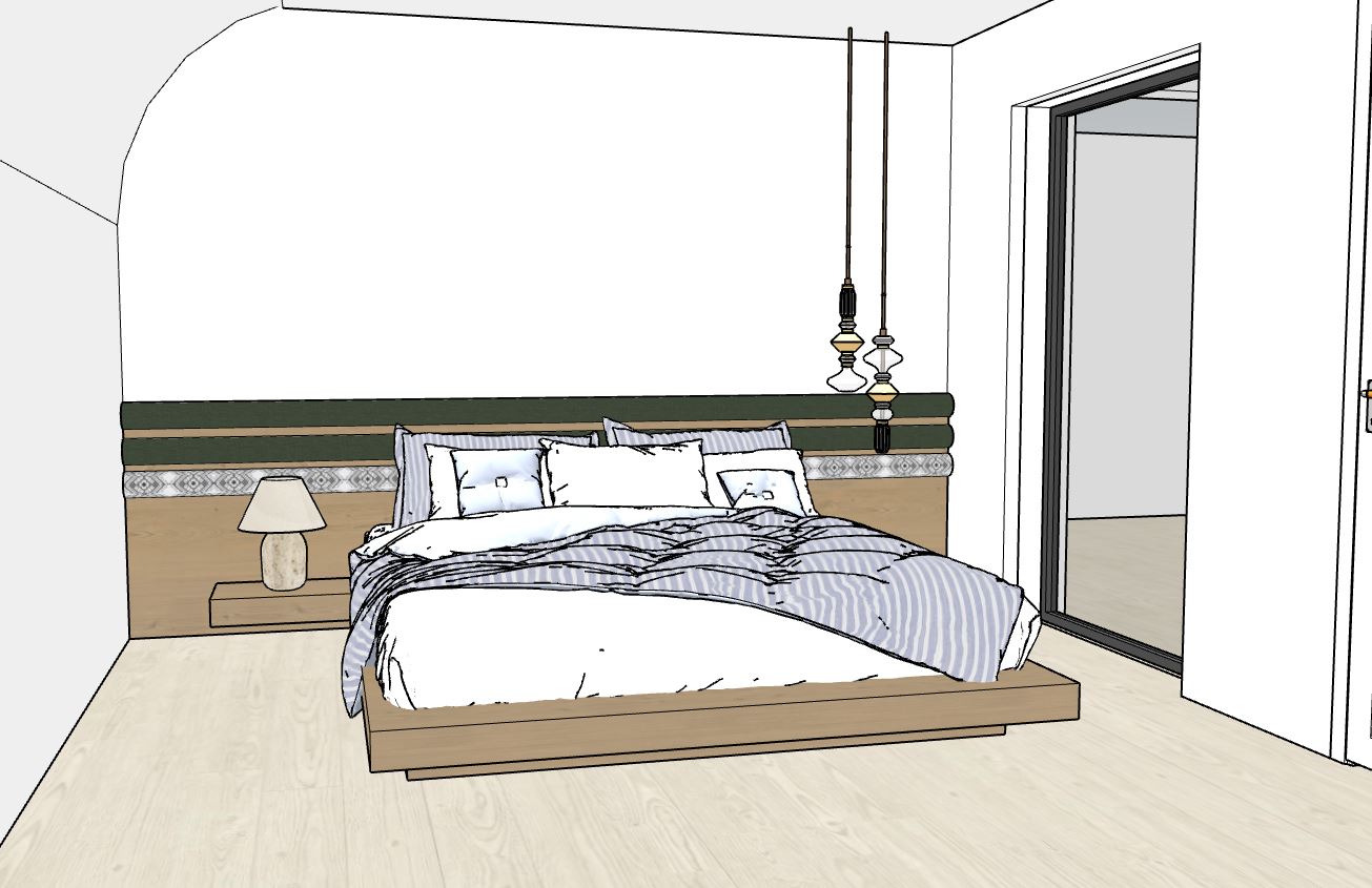 modern cozy bedroom interior with a minimalist design a wooden platform bed with a striped duvet and multiple pillows behind the bed a decorative headboard made of horizontal panels in green and patterned textures light wood flooring and clean white walls on the left side a small wooden nightstand with a simple lamp on the right side three hanging pendant lights with warm bulbs and organic shapes large sliding glass door on the right opening toward another room soft ambient lighting warm tones contemporary and inviting atmosphere high quality 3d render