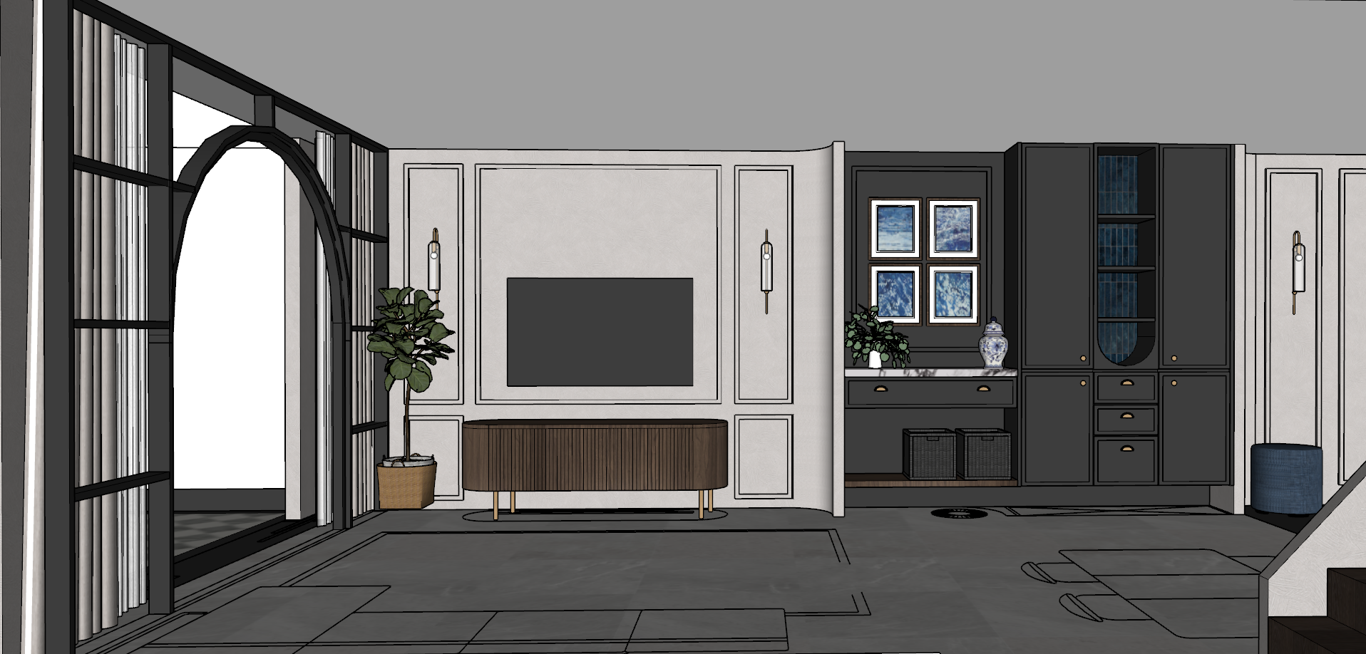 exterior shot the original image is the authoritative reference follow the drawing exactly preserve all wall positions and room proportions exactly no redesign no change of camera angle no layout modification no change on all geometry realistic materials soft global illumination warm ambient lighting led strip accent lighting sunlight entering from windows realistic shadows ambient occlusion highly detailed furniture clean architectural visualization ultra sharp render minimal background high contrast lighting dramatic shadows ray traced lighting photorealistic rendering ultra detailed textures rrn
