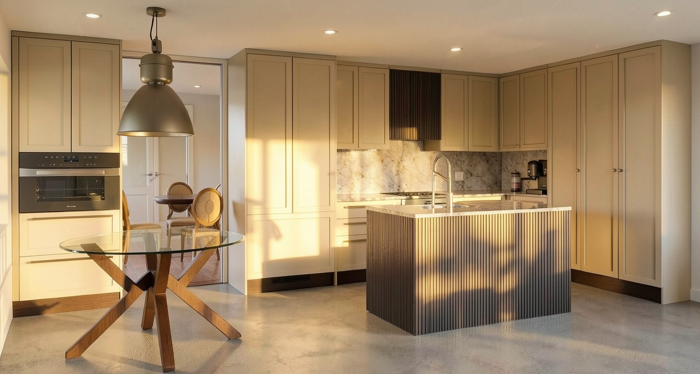 this is a living room and a kitchen put modern furniture chair carpet tv sofa kitchen cabinet decoration elments curtain light and generate a contemoprany interior
