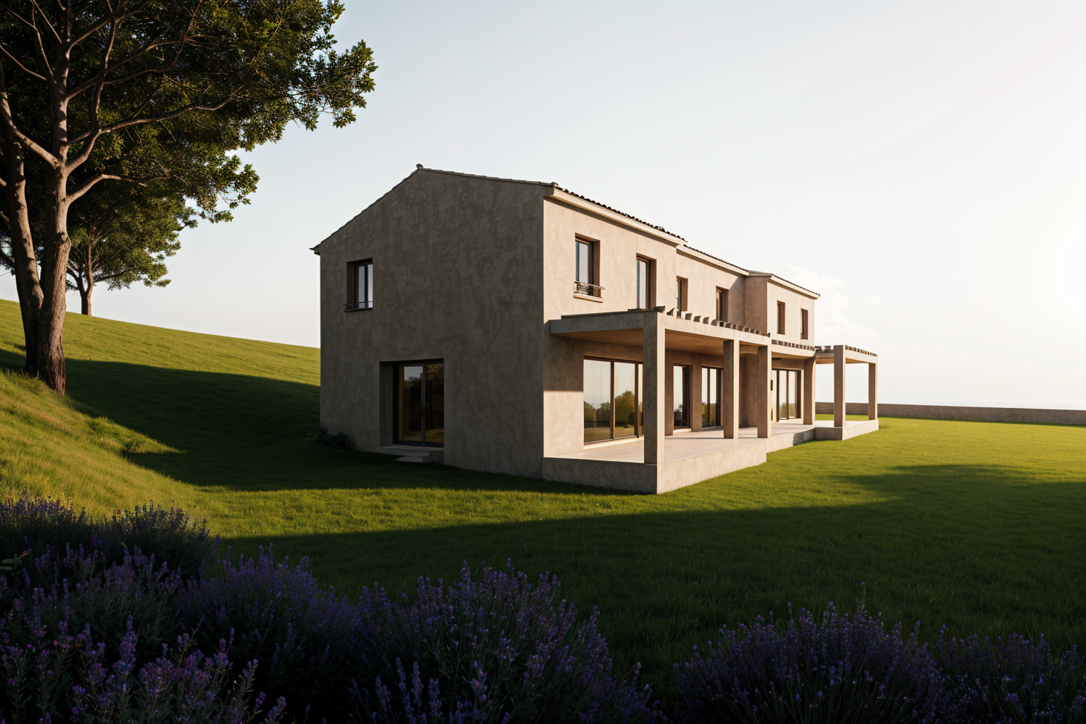 a modern single story house with a black gabled roof and light gray wooden siding the windows are framed in black creating a striking contrast the exterior features two cozy terraces with outdoor furniture in a minimalistic style the ground is a lush green grass surrounding the house with a tranquil natural setting the sky is clear and bright blue casting soft natural light creating a calm and inviting atmosphere