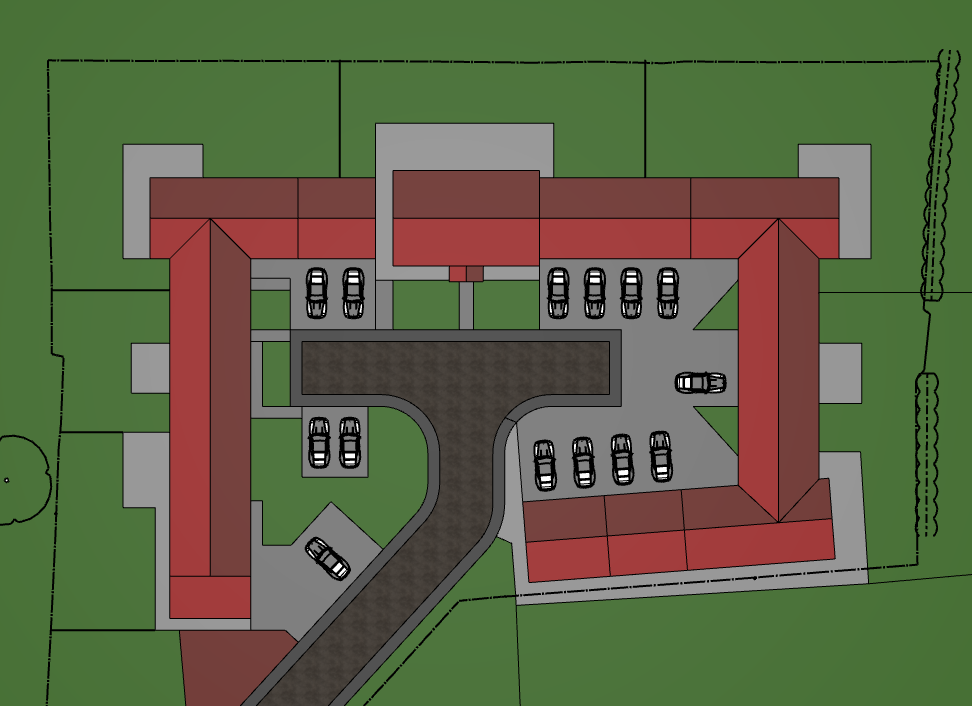 artistic watercolour layout architectural design from a top down view use a palette of soft reds roof tiles for the buildings and incorporate deep green for the natural elements such as surrounding trees and grass add a subtle texture to the parking spaces in a muted asphalt gray populate the parking area with cars in shades of silver and black for contrast the atmosphere should be serene and professional with a touch of luxury maintain shapes and lines of buildings