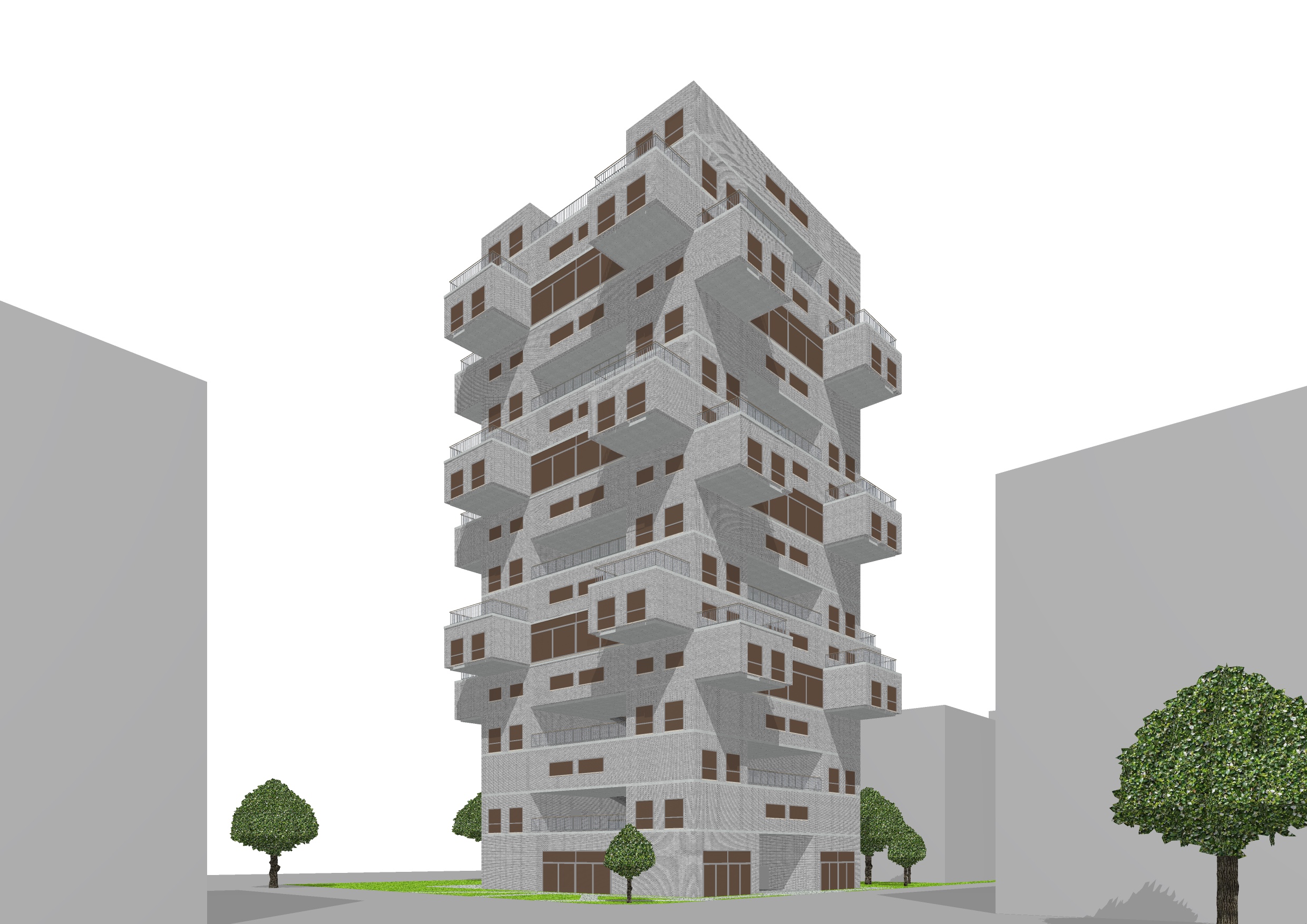 photorealistic daytime exterior rendering of a modern residential high rise building with textured gray brick facade large opaque anthracite windows with natural subtle interior lighting strictly preserve the staggered balconies cutouts and sculptural building structure minimalist neutral surrounding buildings in background clean photorealistic materials soft sunlight from left global illumination high resolution optional light entourage with trees and few pedestrians
