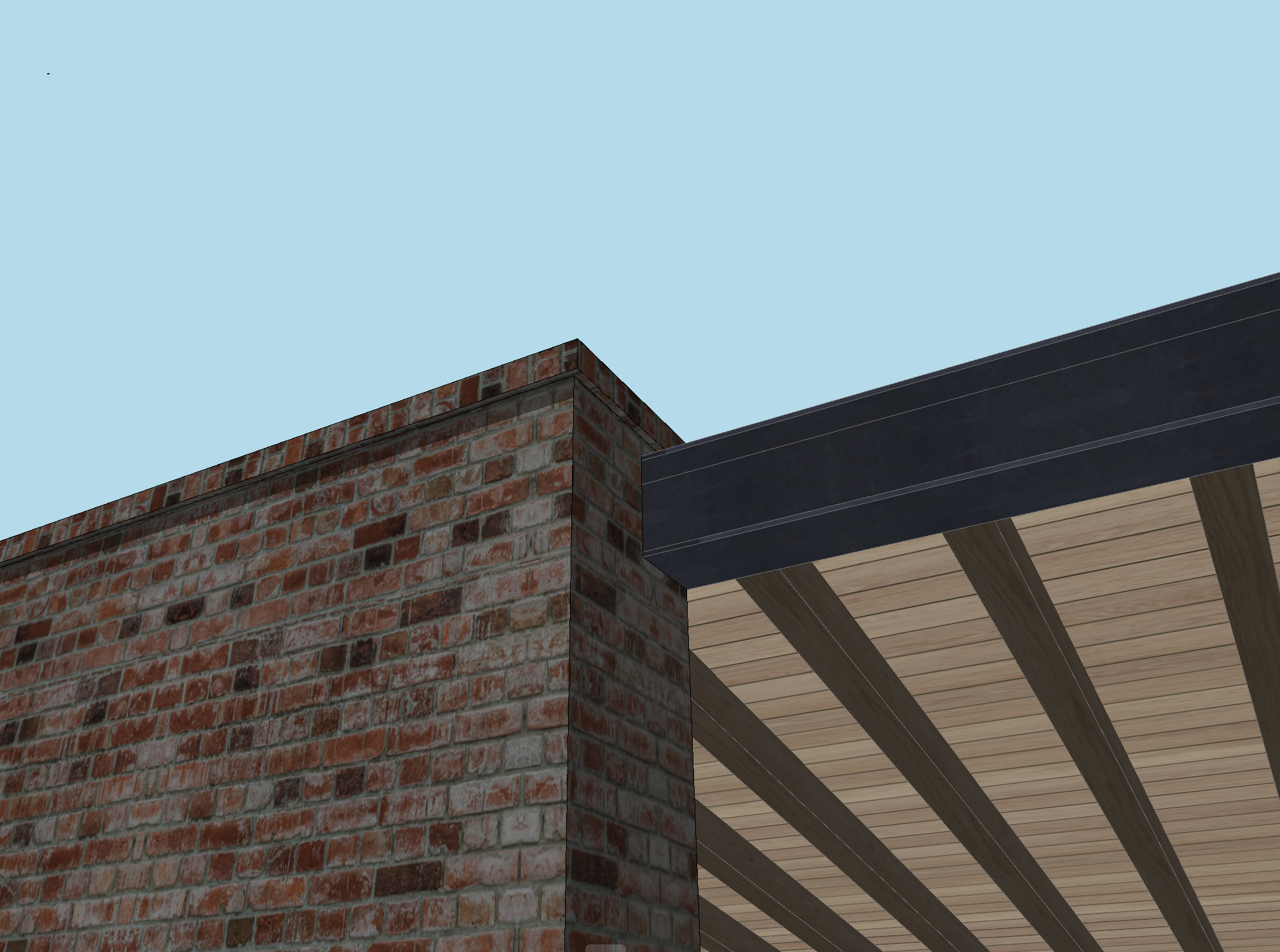 detail shot of a an i beam resting in a thick brick wall supporting a timber framed roof brick to be sacked recycled brick