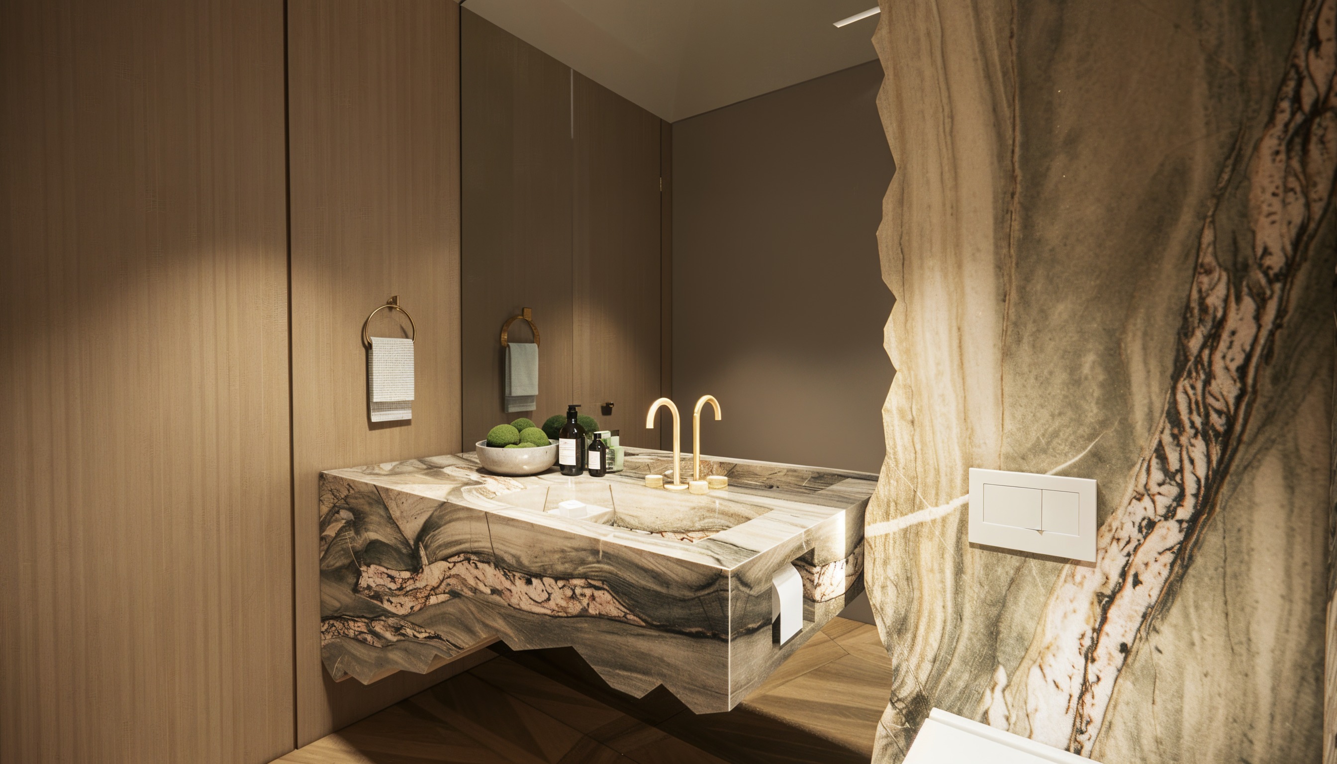 create a render in hyper realistic architectural visualization quality 8k resolution all objects furniture sanitary ware and architectural features must remain in place do not add any objects or delete anything from the image the spatial configuration must remain unchanged warmth gentle reflections soft shadows enhanced color richness and luxurious level realism improve depth and realism through wood grain richness brass highlights fabric texture and polished clarity while keeping the entire scene exactly as originally designed use downward facing light use general daylight lighting in the room soften the jaggedness of the vanity stone detail at the bottom of the vanity less harsh zig zag and more of a subtle chipped stone in a diagonal line