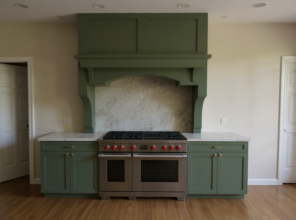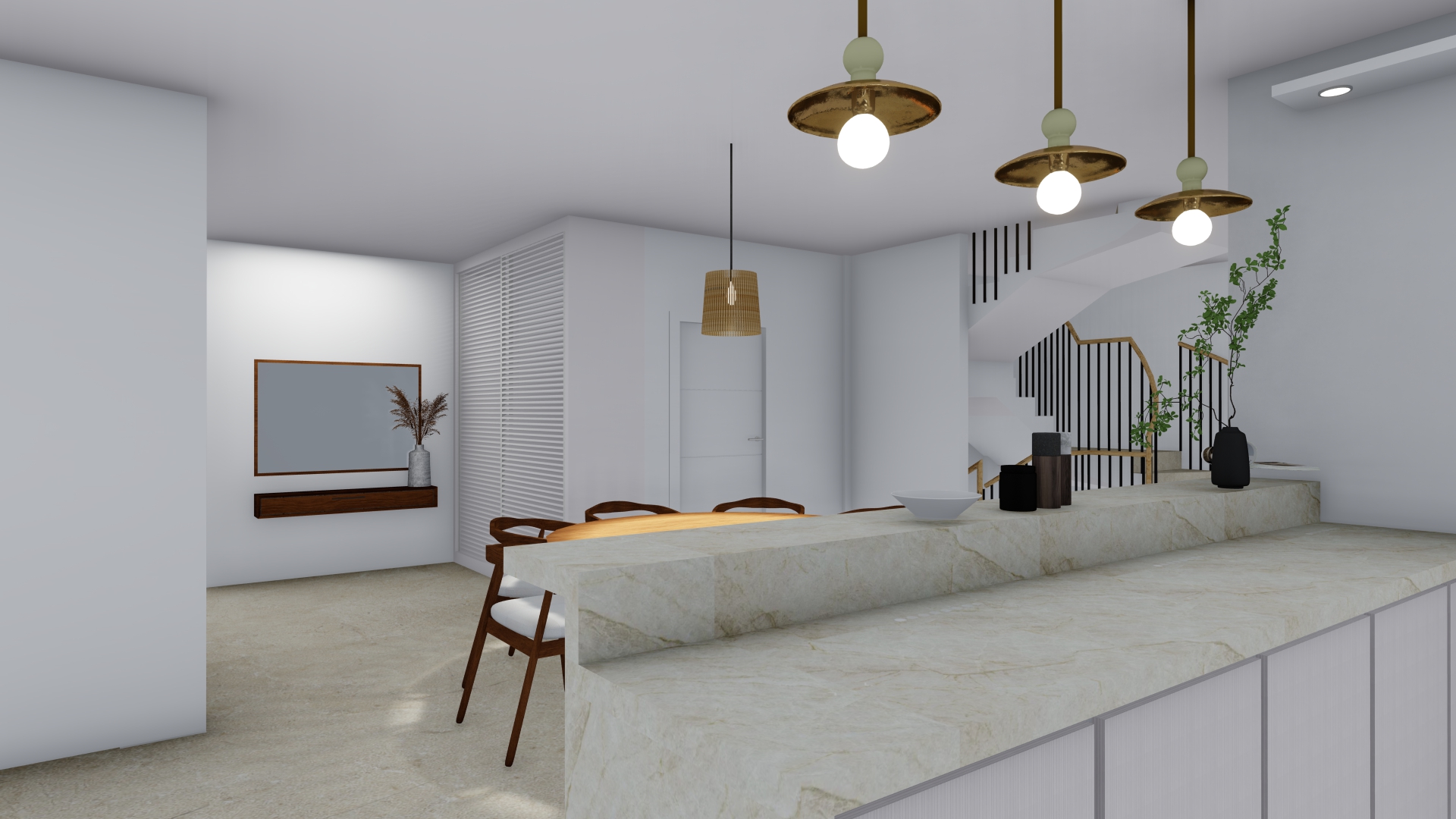 cozy and modern open plan kitchen and dining room featuring a round wooden table with a rich walnut finish surrounded by elegant curved wooden chairs the kitchen island boasts a sophisticated marble like countertop in creamy beige tones three pendant lights with brass finishes hang above casting a warm and inviting glow the walls are painted in soft white enhancing the natural light from the large windows a touch of greenery with a potted plant adds freshness the atmosphere is chic and contemporary with a hint of warmth and comfort