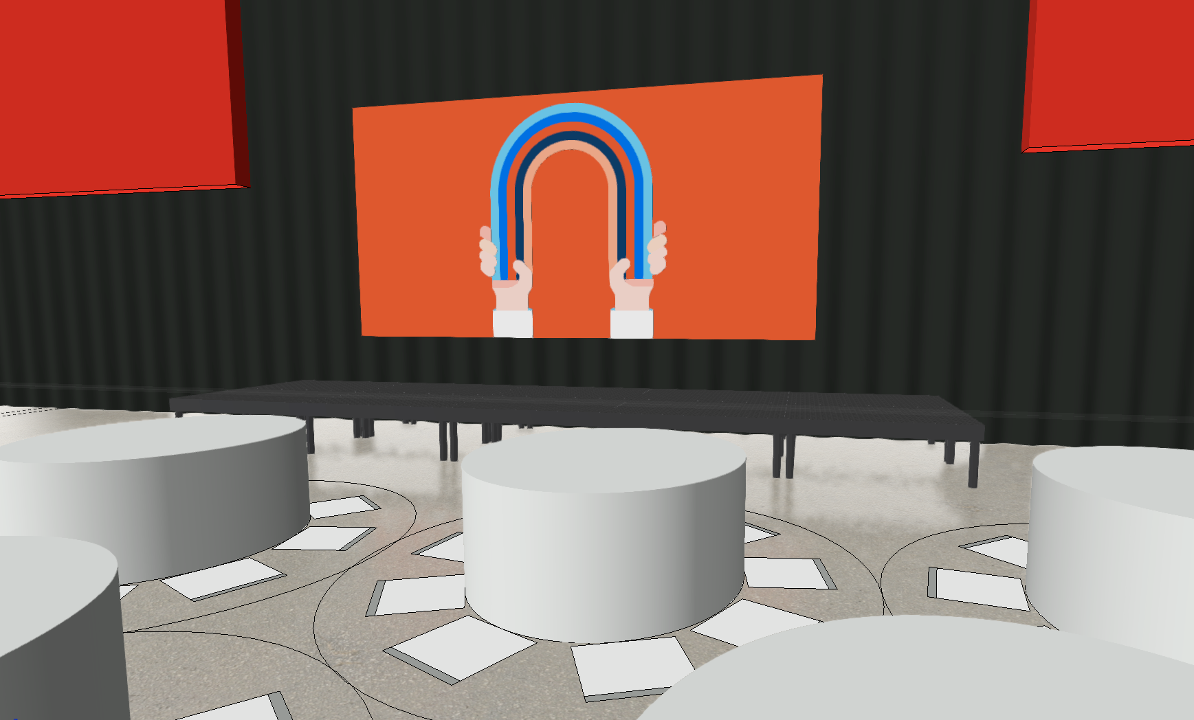 realistic high end corporate event render maintain exact geometry and camera angle dark auditorium environment with dramatic cinematic lighting add a soft top down spotlight centered on the stage with subtle volumetric haze to reveal the light beam introduce deep blue ambient wash lighting across the space with vertical purple downlighting along the back curtains to create depth and rhythm led screen emits soft light onto the stage and floor with controlled bloom not overexposed increase contrast between lit stage and darker audience environment showing people sat at tables floor reflections should be subtle satin not glossy add soft edge lighting under the stage platform keep background dark with controlled falloff enhance realism with global illumination and soft indirect bounce lighting overall look should feel premium minimal and cinematic like a high end tech keynote presentation please add chairs