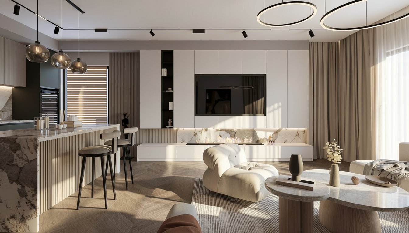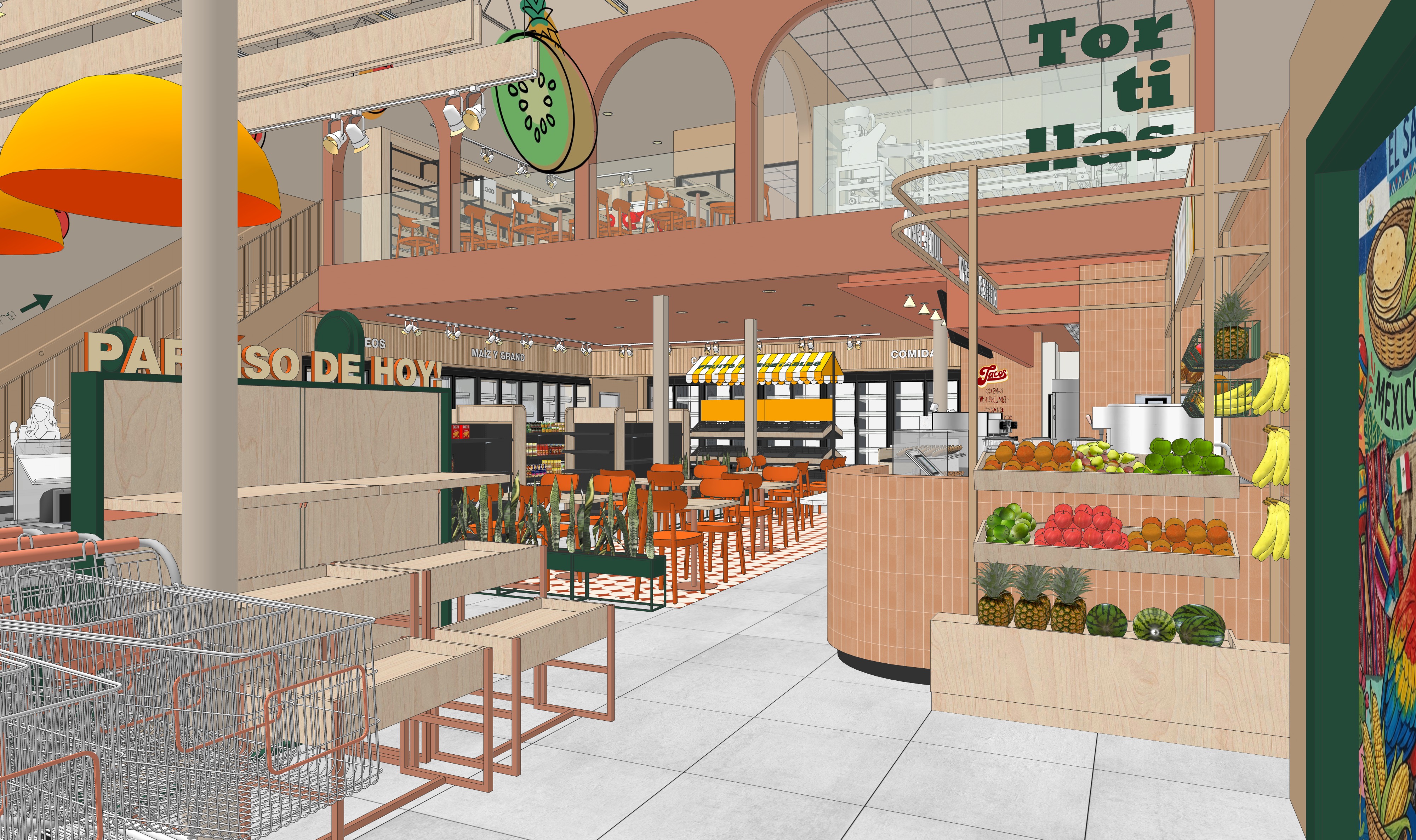 transform the provided market store interior image into a high end photorealistic render with warm day light atmosphere soft glowing highlights and relaxed latin energy while keeping everything exactly the same same proportions same bar shape same booth seating same ceiling curves same wall finishes same yellow curtains same materials and same spatial configuration do not move or alter any objects geometry textures colors or furniture positions the chairs throughout the restaurant must remain exactly in the same locations and proportions but their materials should read realistically the bar stools should appear upholstered in soft reddish brown leather with subtle natural sheen and cushioned tactile texture the dining chairs at the tables should appear in the same reddish brown tone but upholstered in soft velour with a matte plush surface and gentle directional nap while keeping their shapes frames and positions unchanged add premium table settings including wine glasses champagne flutes tropical style cocktails elegant plates cutlery cloth napkins and a seafood tasting arrangement with oysters while keeping all tables and chairs in their exact positions include modern young guests seated at the bar and at selected tables casually social correctly scaled tastefully integrated without crowding or obstructing architectural details add two bartenders behind the bar preparing drinks and interacting naturally while preserving the bar s structure and alignment the mosaic seafood display counter must clearly appear filled with ice fish lobsters shrimp and shellfish with cool reflections moisture and texture while keeping its exact position and shape unchanged on the bar shelves add wine bottles and premium alcohol bottles arranged tastefully and evenly while keeping the shelving structure unchanged the shelving should feature warm and bright accent lighting enhancing reflections and bottle silhouettes the wall behind the bar shelves must clearly appear as amber glass in a deeper richer golden amber tone with a ribbed textured surface and illuminated from behind with warm vivid backlighting while maintaining its exact geometry proportions framing and alignment lighting should emphasize golden hour warmth gentle reflections soft shadows enhanced color richness and luxurious catalog level realism improve depth and realism through wood grain richness marble shine brass highlights fabric texture and polished clarity while keeping the entire scene exactly as originally designed