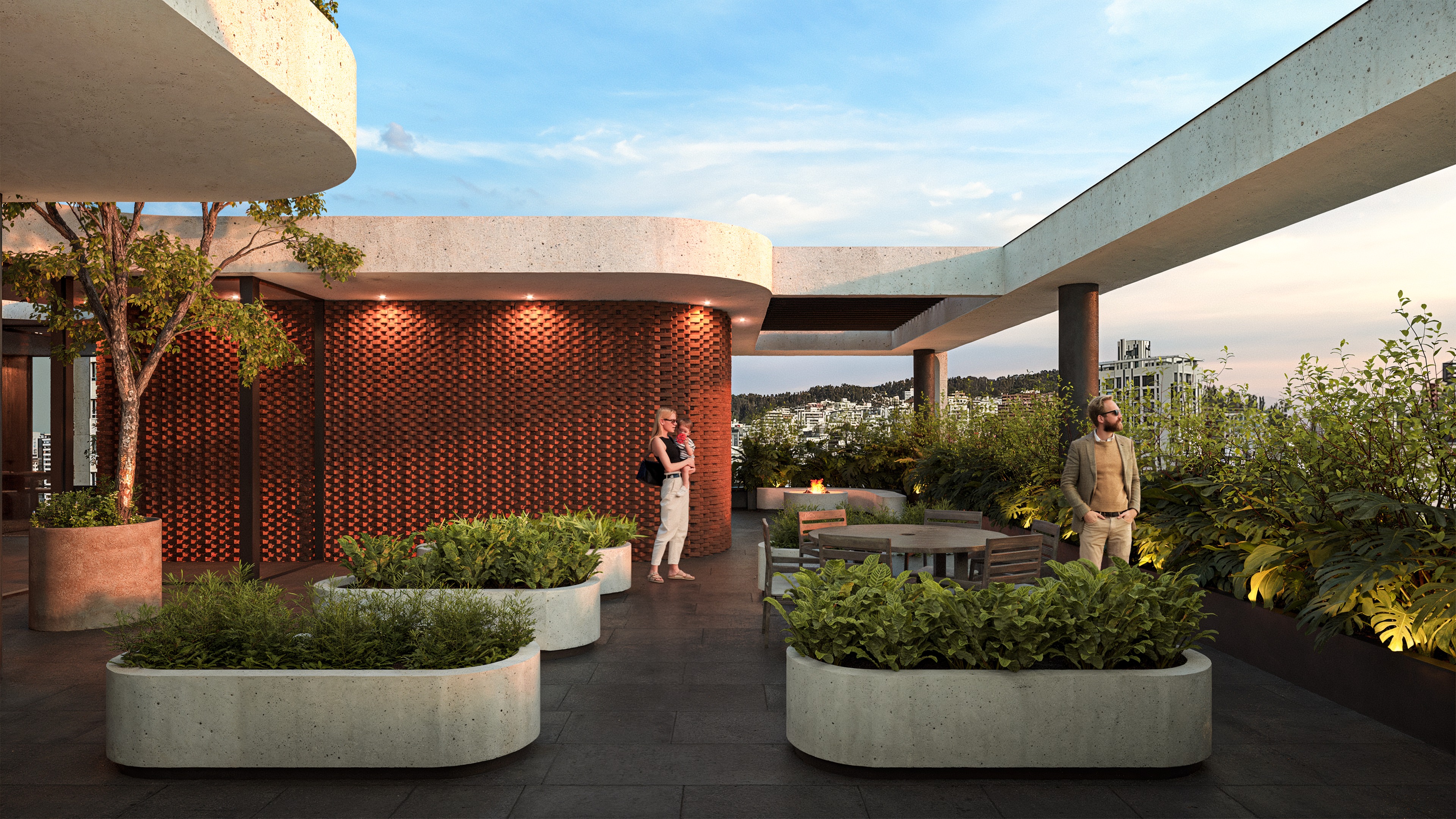i want this image to look like it belongs in a architectural digest cover i want it to look architectural but artistic its a very elegant rooftop featuring a urban horticulture space with curved brick walls that have a lot of craft work the views are from the urban residential buildings in de city of quito in the sunset
