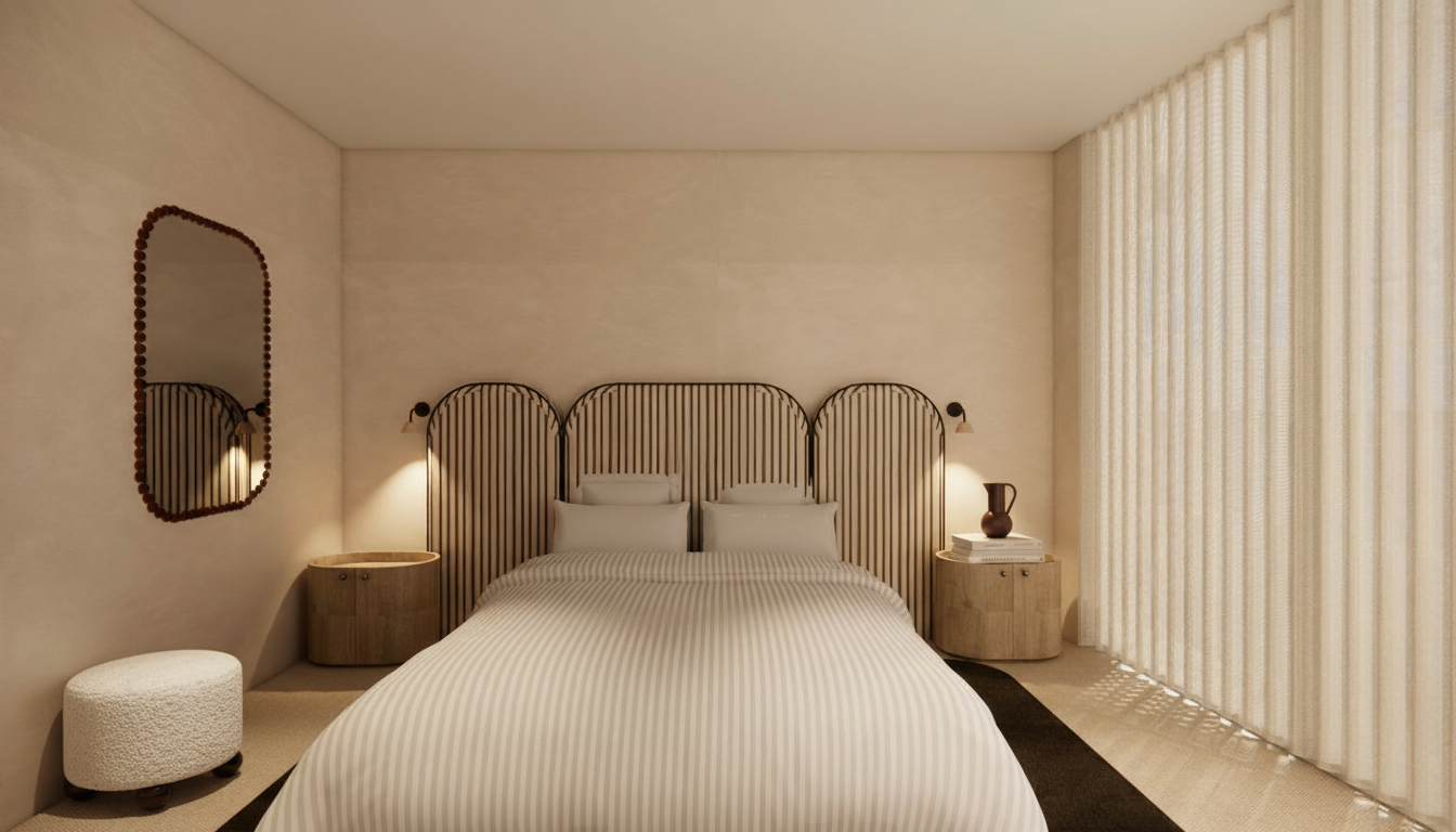more light warm light and warm wood and glossy worktop japandi minimalistic style add warm light under the upper white cupboards add small cofeee machine on the worktop add a small japandi vase with eucaliptus leaves on a cofee table in brushed gold tray add inside in the cupboard near on the right side to the bar chair a wine glasses and fluted glass add light cream linen roman blinds only to the windows area save the paintings without blinds