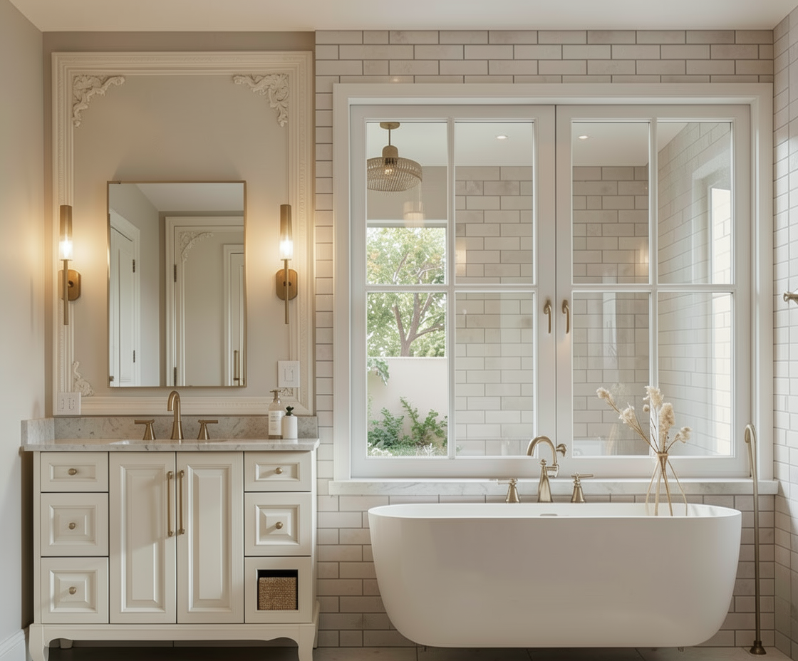 realistic photographic interior rendering in natural daylight use the provided sketchup base image as the structural reference preserve every single architectural element exactly as positioned all cabinetry layout open shelving island proportions wall oven gas range refrigerator sink faucet interior doors ceiling flooring and all structural walls remain completely unchanged do not add remove or reposition anything except what is explicitly stated below atmosphere light warm natural daylight filling the space softly gentle ambient shadows the existing wall sconce fixtures remain exactly as positioned champagne brushed bronze finish warm and aged not shiny brass not chrome no pendant lighting added anywhere cabinetry painted cabinets every painted cabinet the tall cabinet tower on the left wall the upper cabinets flanking the hood and any other painted section shown renders in a warm taupe cream that reads almost white but not quite the tone is a soft creamy off white with a whisper of warm beige taupe undertone sitting just beneath the surface refined quiet barely there warmth it should read as an elevated warm off white from across the room but reveal its soft taupe cream depth on closer look not stark white not bright white not grey not yellow shaker style door and drawer profiles exactly as shown on every painted cabinet cabinetry wood cabinets every wood cabinet renders as a warm neutral smoked oak with a taupe undertone a medium depth oak that reads balanced neither too cool nor too warm the base tone is a refined taupe brown with visible straight grain running vertically the grain is pronounced and visible but the overall color stays calm and neutral aged european smoked oak at a perfect middle tone not golden not blonde not grey not dark walnut matte to satin finish no gloss this tone applies to every wood cabinet every wood drawer front and every open wood shelf in the image hood the hood body renders in the same warm taupe cream painted finish as the painted cabinets the hood s trim detailing and any framing accents render in the same warm neutral smoked taupe oak as the wood cabinets creating a two tone architectural moment that ties the palette together critical glass placement locked glass inserts appear only on the upper cabinets that already show glass in the base rendering the small upper cabinets flanking the hood area every other cabinet every painted taupe cream cabinet every lower wood cabinet every drawer front every pantry tower has solid opaque shaker doors or drawer fronts with absolutely no glass do not add glass to any cabinet that does not already show glass in the base image do not make anything transparent that is not already transparent hardware every single pull and knob throughout the entire kitchen is champagne brushed bronze warm aged slightly darkened gold bronze tone not yellow brass not polished gold not chrome not black present on every cabinet door and every drawer front throughout the entire kitchen countertops island backsplash all these surfaces are the same continuous stone a warm creamy beige quartzite in the spirit of taj mahal quartzite base color is a warm sand cream with a soft blush ivory undertone not white not grey veining is soft flowing cloudlike diffused taupe and warm golden grey movement blending into the background rather than sitting boldly on top subtle organic and luminous wraps the full perimeter countertop the island top and waterfall edge and the full height backsplash behind the range polished finish with a quiet warm sheen new coffee nook in the small recessed bay on the left in the small recessed bay alcove on the left wall the narrow inset area between cabinet runs style a minimal integrated coffee nook the countertop in this nook matches the same warm beige quartzite continuously on the counter surface one modern matte black or brushed stainless espresso machine compact minimal not bulky a small matte ceramic canister set of two cream or soft taupe a small stack of two ceramic espresso cups with saucers and one small trailing plant in a minimal ceramic pot the wall behind the nook in this recessed area is finished in the same warm beige quartzite backsplash continuing up the wall tying it into the main kitchen material palette clean intentional and editorial not cluttered the coffee nook is styled within the existing recessed architectural space only do not add new walls cabinets or structural changes sink stays exactly as shown same material same color same finish appliances wall oven exactly as shown gas range exactly as shown refrigerator panel ready or stainless exactly as shown no changes open shelving left wall renders in the same warm neutral smoked taupe oak as the wood cabinets styled with one small trailing green plant in a simple matte ceramic pot a tight stack of two linen covered hardcover cookbooks lying flat and one minimal matte ceramic vessel clean and intentional glass cabinet interiors only where already shown in base neatly stacked white ceramic plates simple glassware and one small minimal ceramic object visible through the glass island styling one medium leafy green plant in a minimal stone or ceramic pot one ceramic fruit bowl with mixed seasonal fruit two hardcover books stacked flat with a small object resting on top nothing else on the island surface flooring light natural wood plank flooring exactly as shown warm pale tone straight planks unchanged do not add glass to any cabinet not already shown with glass do not add pendant lighting do not add rugs furniture or any architectural elements beyond what is