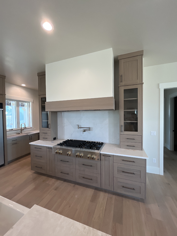 do not change the cabinets in any way preserve the exact cabinet colors materials finishes dimensions door and drawer styles hardware spacing alignment and all geometry exactly as shown do not alter the countertop shape backsplash appliances flooring lighting fixtures or wall structure only remove the construction materials clutter and mess from the scene clean the room and make it look finished and staged add a few simple tasteful home accessories appropriate for the style of the space but do not add or remove any furniture windows or architectural elements maintain the original lighting direction and realism enhance clarity and polish the photo while keeping the cabinetry and room design completely unchanged do not alter the lighting to keep the cabinet colors as they are in the image stage for a kitchen with natural lighting