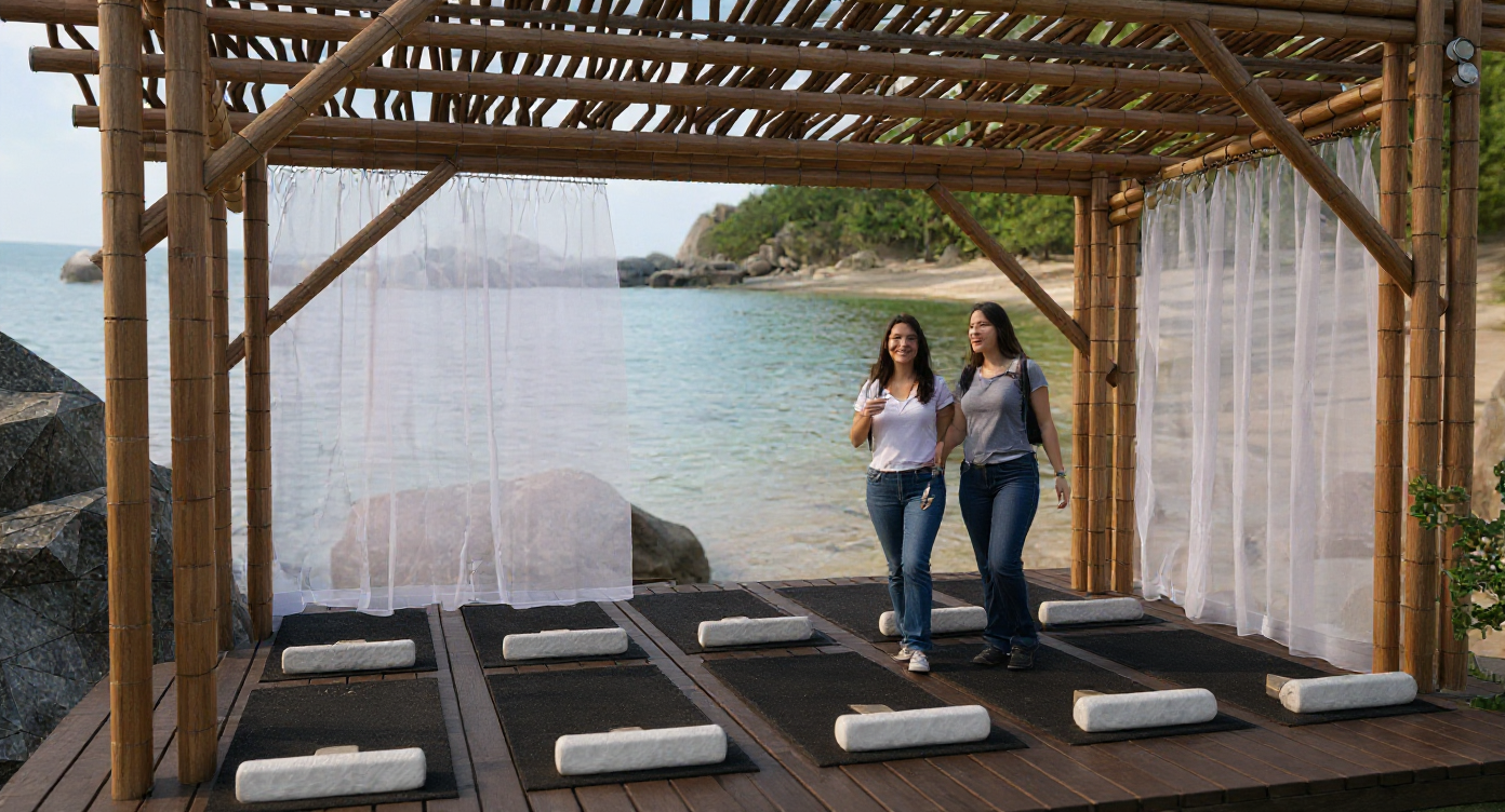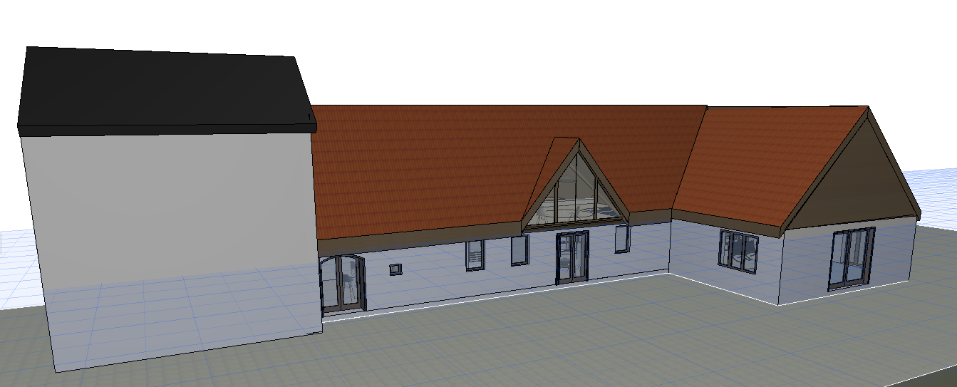 the roof is in light beige color and facade is in white color ground is in small square rock