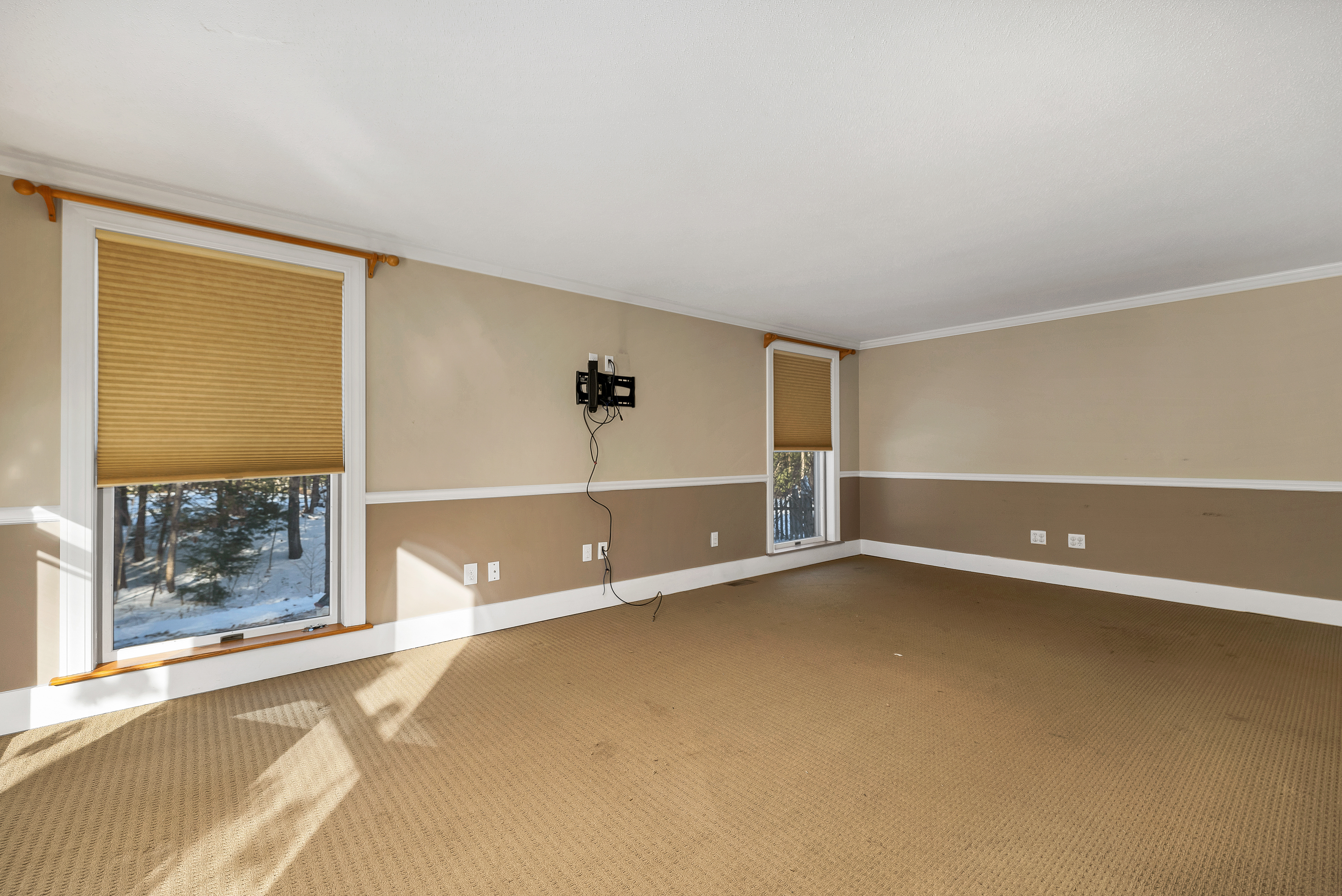 a relaxing room that is great for watching movies or resting with a tv on the wall between the two windows
