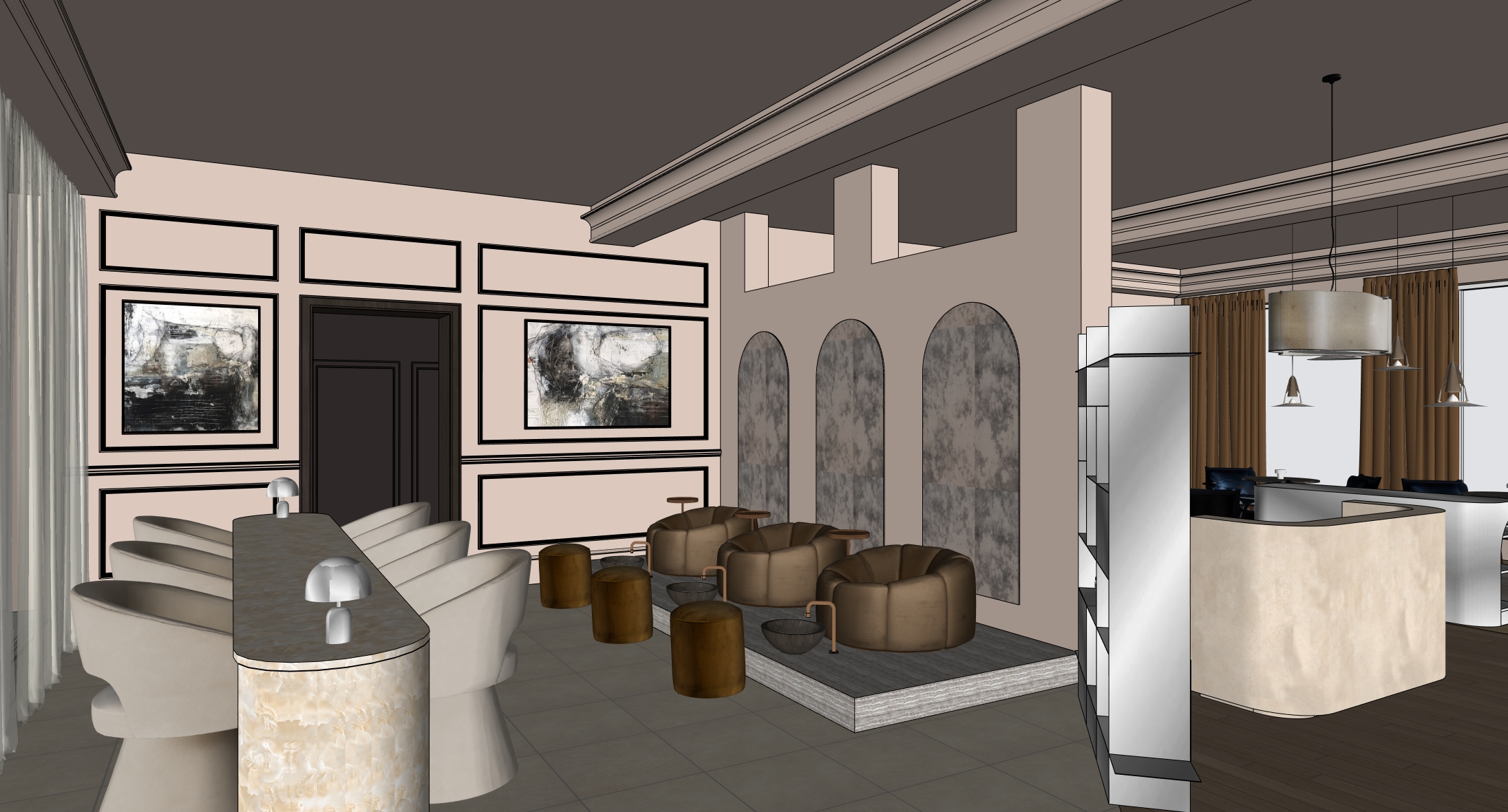 render dont change furniture arched details are mirror with halo illumination ensure all seating stays the same