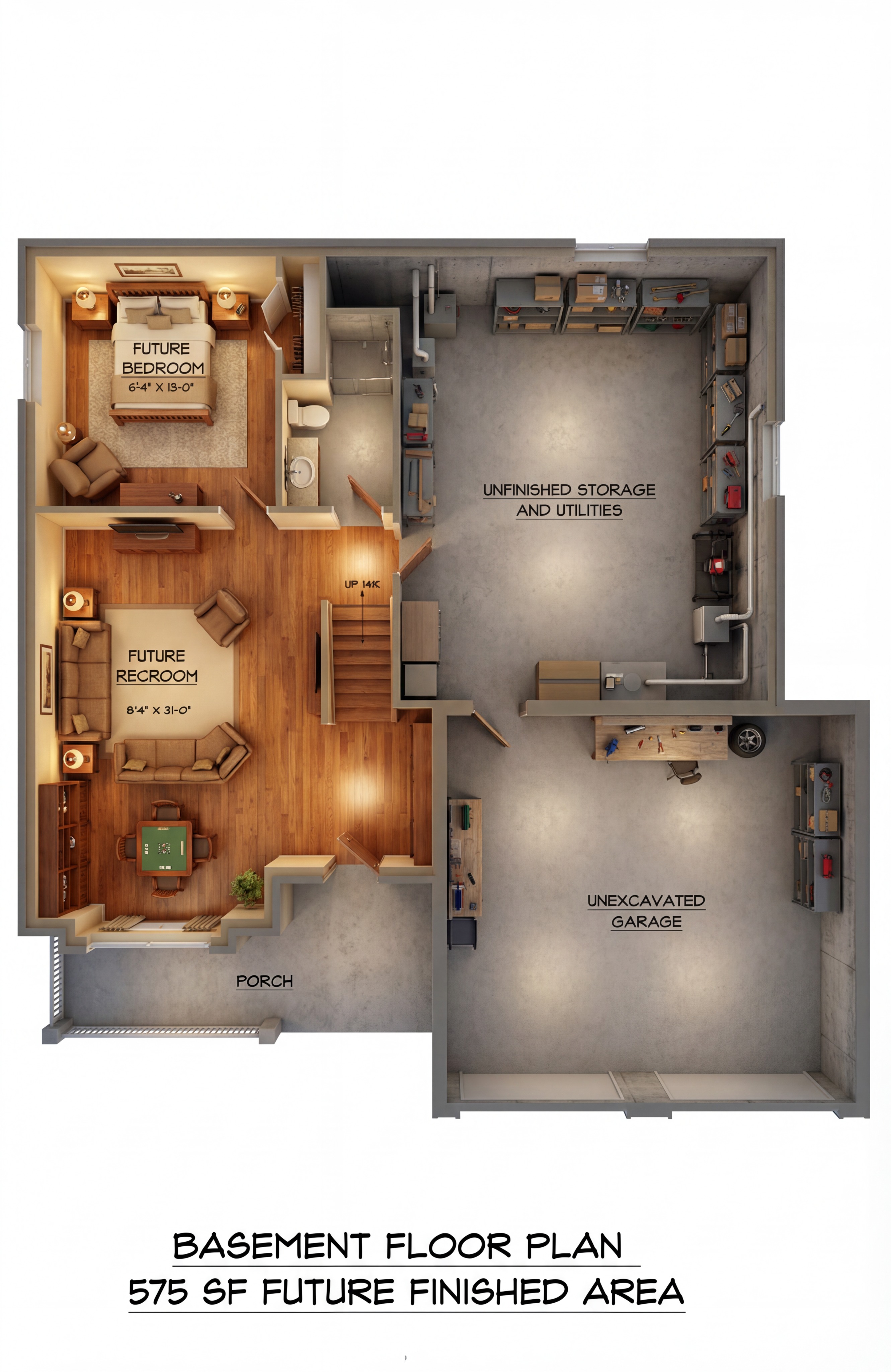add modern furniture in future rec room remove porch in front of future recroom