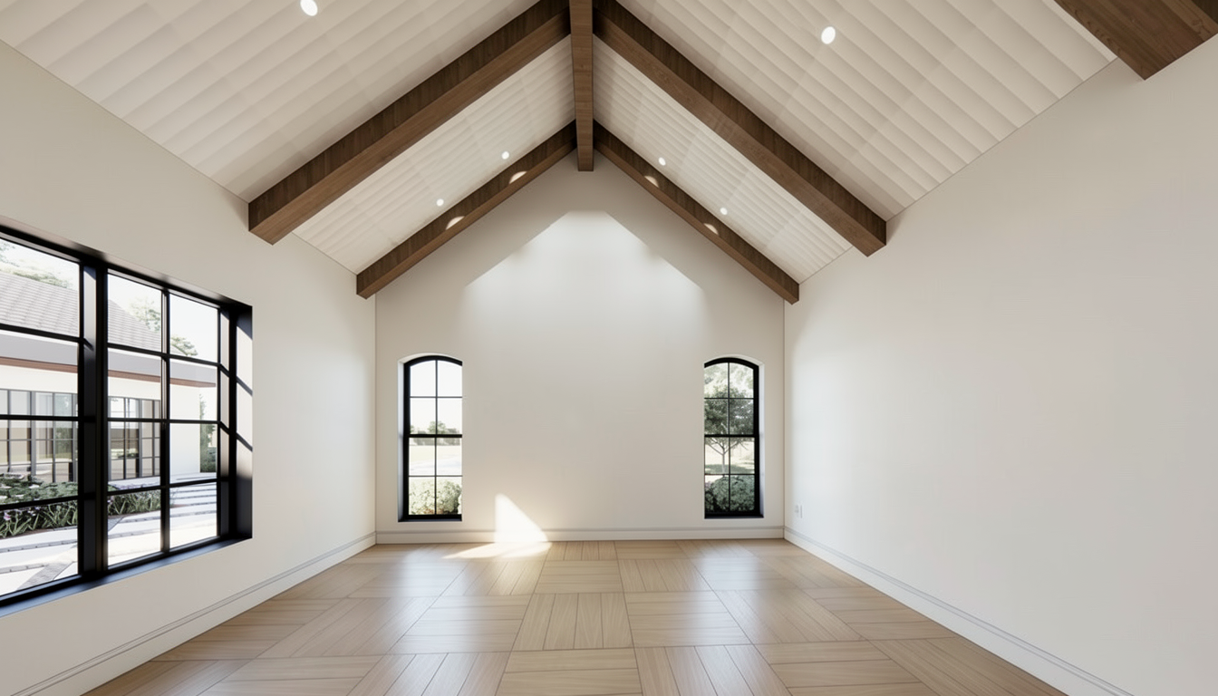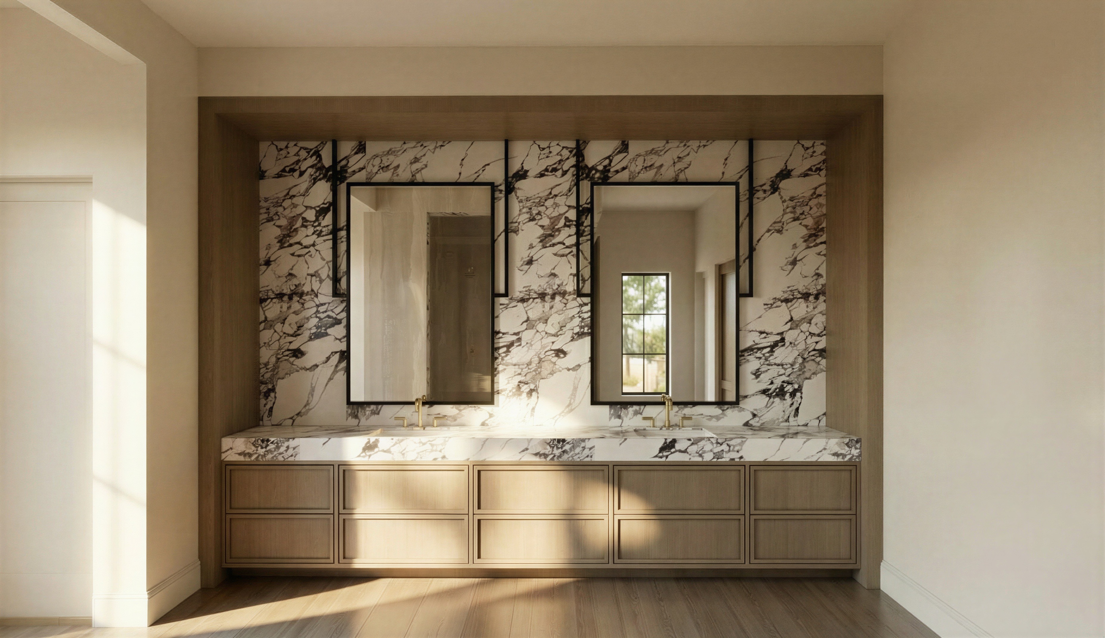 brighten the image slightly while maintaining natural realism increase overall exposure slightly to create a editorial architectural photograph enhance natural daylight and allow soft light to fill the room while maintaining realistic shadows and material depth whites should appear clean and luminous especially sherwin williams origami white surfaces without blowing out highlights limestone and calacatta viola stone should remain soft natural and matte with visible texture do not change architecture layout materials colors fixtures or design elements in any way the result should feel like a professionally photographed luxury bathroom with natural light and balanced exposure