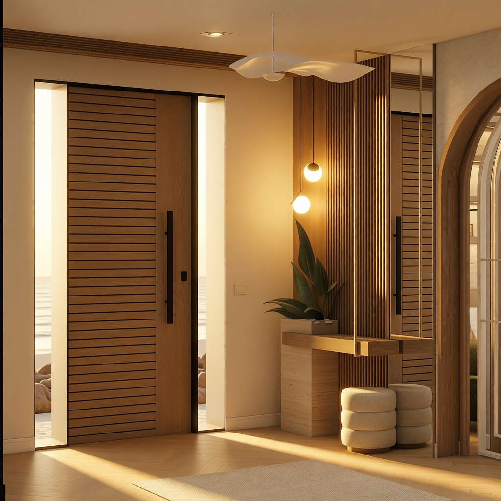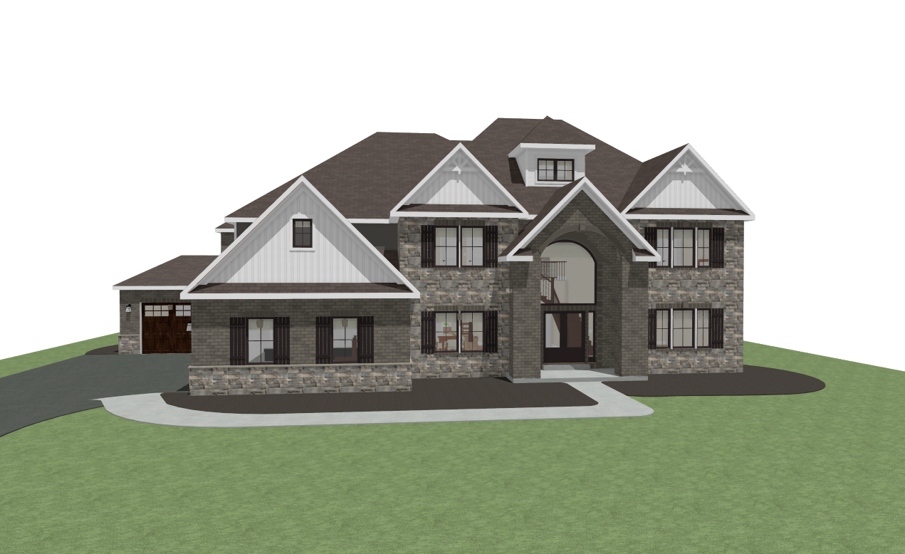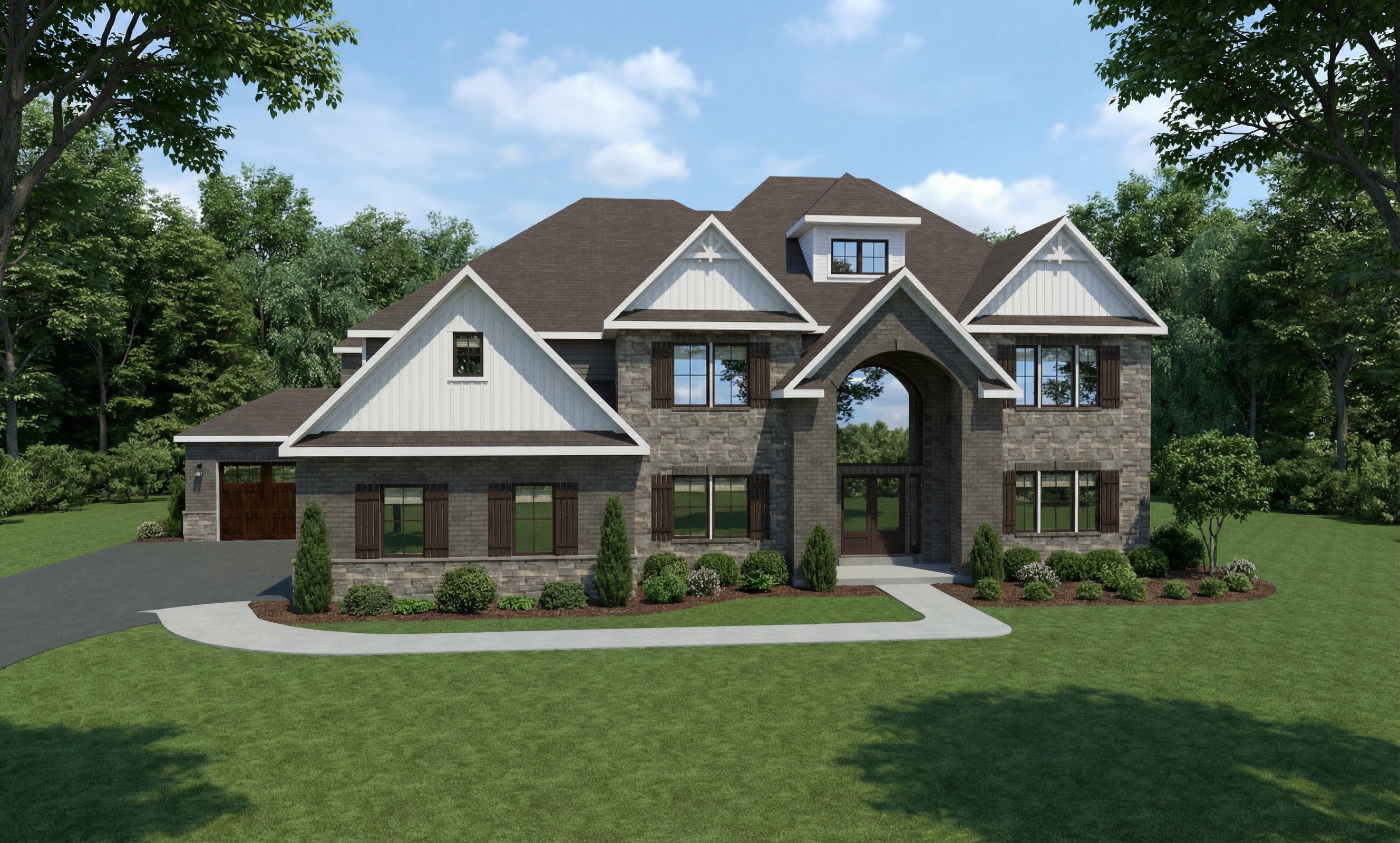 render this 3d image to appear photo realistic maintain all existing architectural materials and structural elements exactly as shown enhance the setting with a lush well maintained landscape include minimal beds manicured shrubs and a tree lined backdrop that frames the home naturally the windows should have a glossy finish with clear reflections of the surrounding trees and sky lighting should feel natural with soft shadows and realistic depth to bring the scene to life