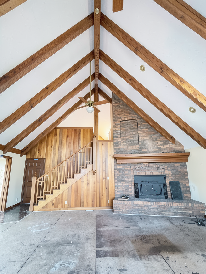 replace the garage door with a more traditional styled door paint the brick white replace the wood fireplace with an electric gas fireplace add a natural wood flooring paint the wood paneling on the walls sherwin williams slate remove the lighting from the ceiling