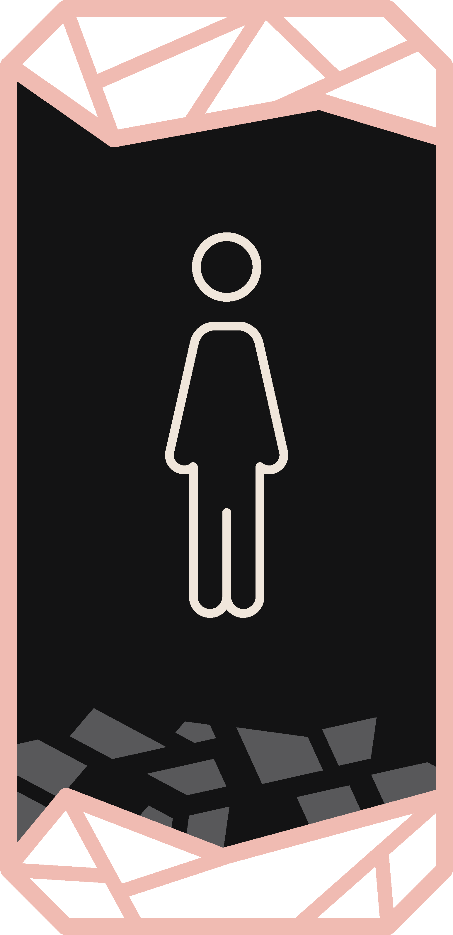pink frame is stainless steel rose gold black is black mirror white icon is cutout acrylic ivory signage mounted on wall 5 star hotel environment isometric view next to a closed door