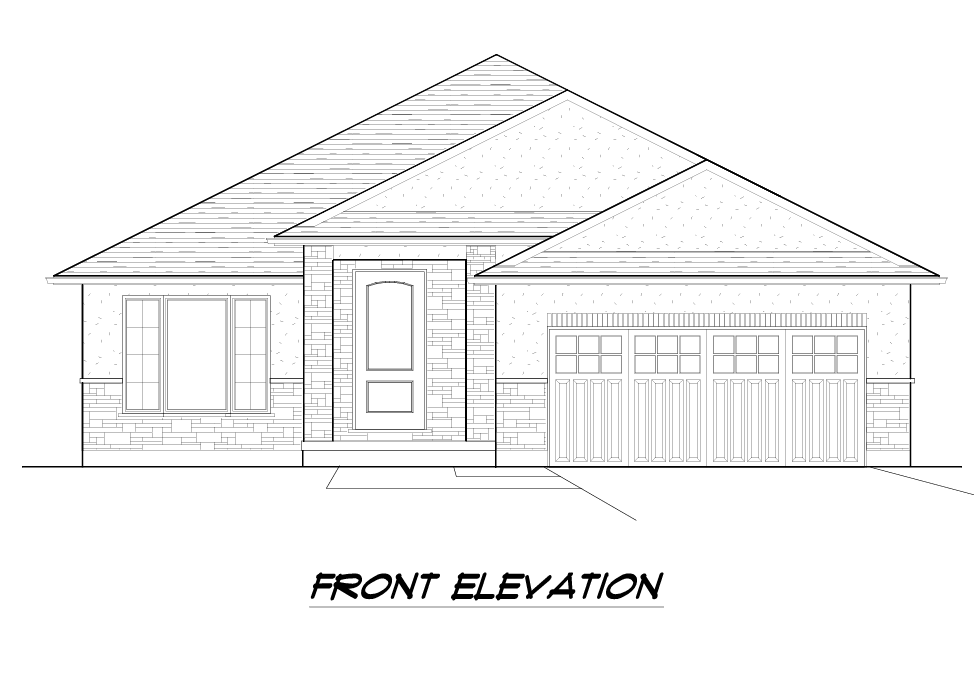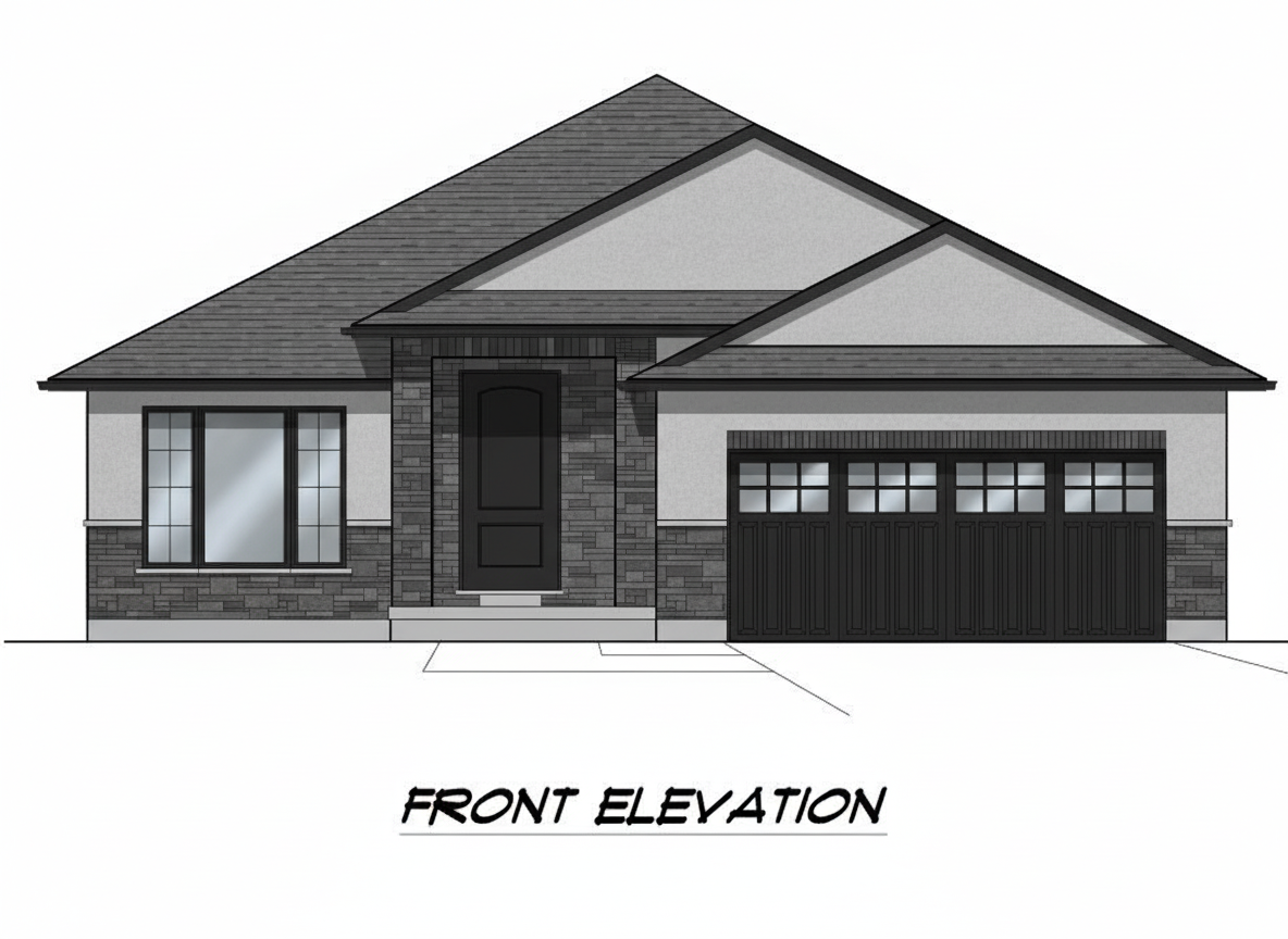 two tone grey roof dark grey soffit and fascia light grey stucco black garage door and window frames dark grey brick black front door show landscaping at front trees on sides and sky with clouds