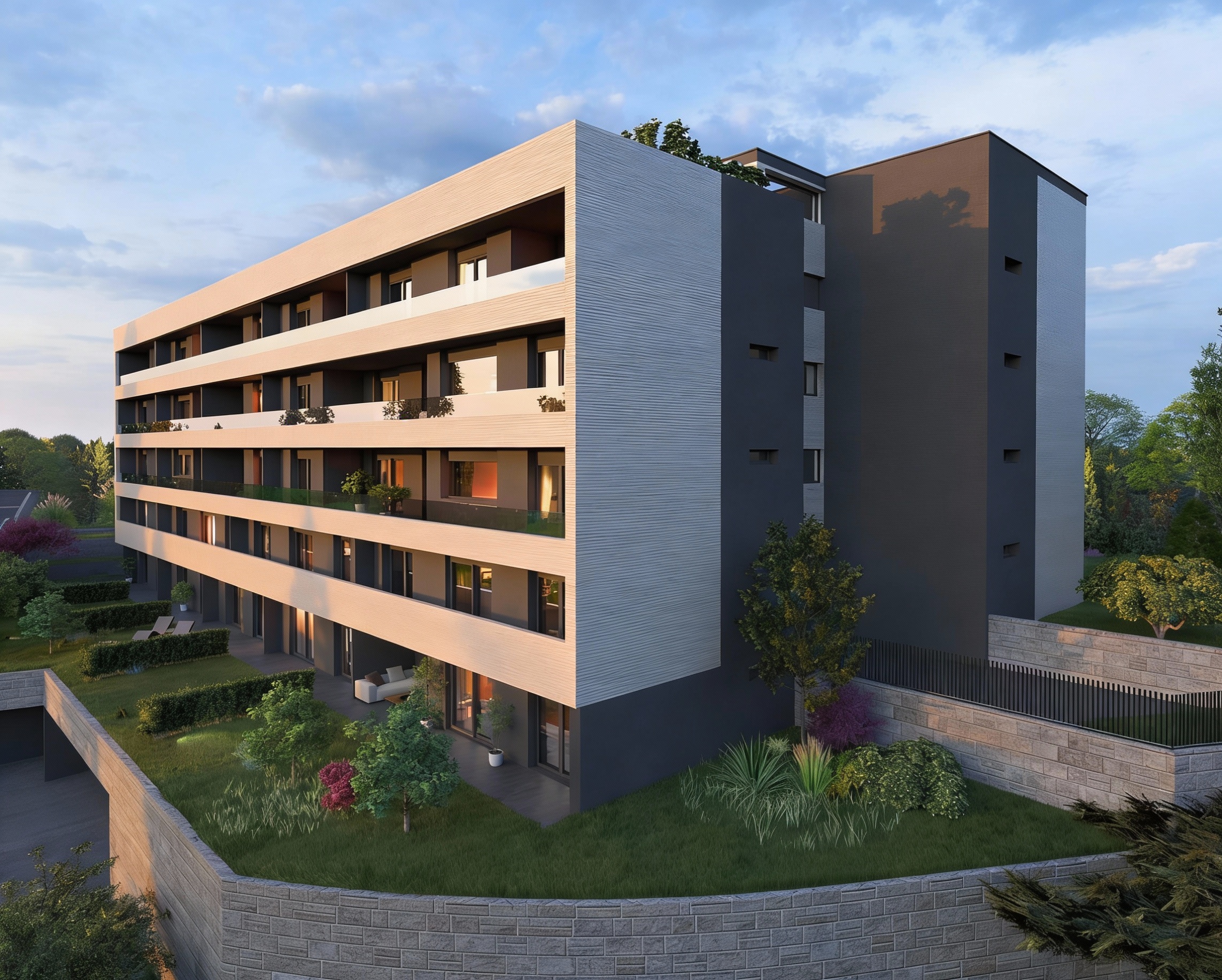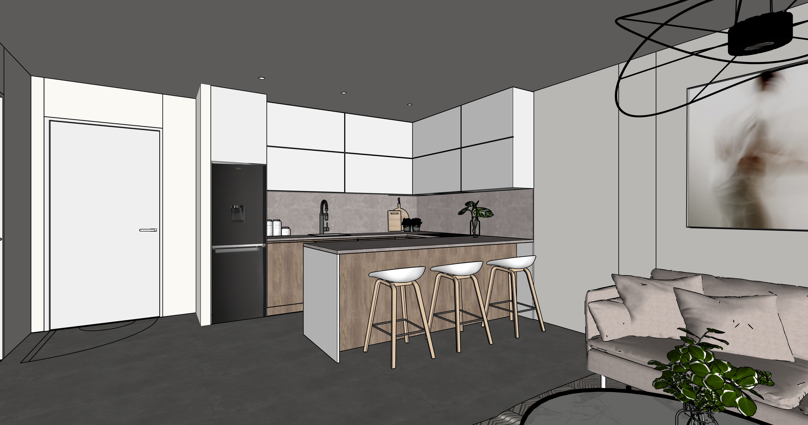 render a modern kitchen with a serene warm atmosphere use natural light to illuminate light beige walls and a soft beige ceiling feature a sleek kitchen island with a smooth grey countertop and light wood cabinetry the top cabinets are white lacquered include beige cushioned bar stools with black metal legs add a black oven and a minimalist black faucet on a marble backsplash the flooring is made with light taupe tiles in 60x120 dimensions incorporate subtle circular wall lights with a soft glow and a minimalist black and white abstract painting place a bowl of green apples on the counter for a fresh touch