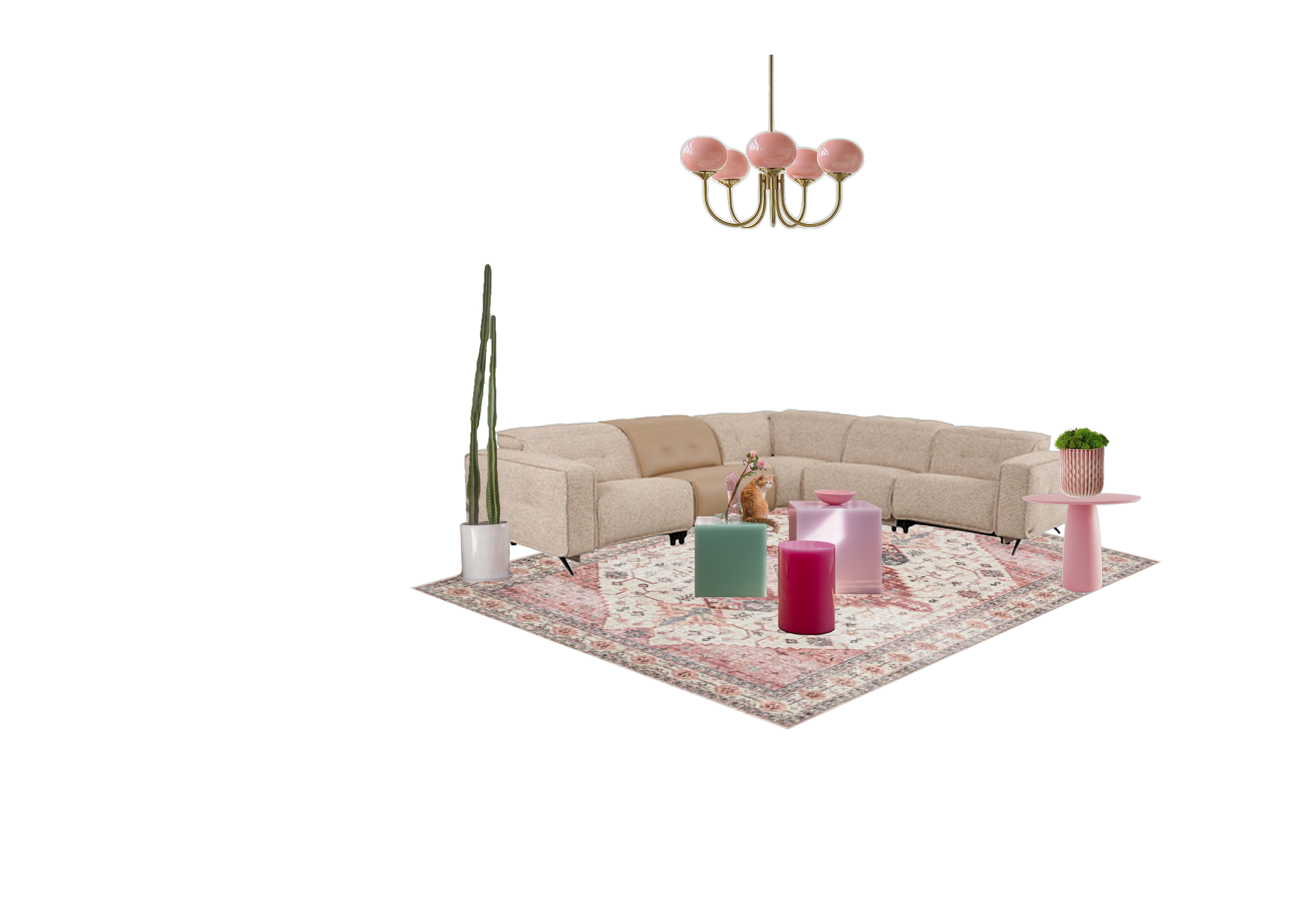 create a warm and comfortable mid century modern and colorful large flat and spacious living room to create a soft and elegant atmosphere the background wall has a modern decoration style composed of various pink lines in the center of the living room a fluffy beige l shaped sofa is placed surrounded by a soft pink and cream vintage rug a small pink round table is placed on the table with a green potted plant and the floor is made of natural wood in addition there is a bright pink cylindrical table and a translucent pink square table modern art works with warm toned abstract shapes are hung on the walls and floors and a chic pink spherical brass chandelier hangs above the head through a window the iconic building is outside use soft decorative elements and tall cacti planted in white pots to embellish the space and add a touch of green adjust the lighting to create a warm and pleasant atmosphere