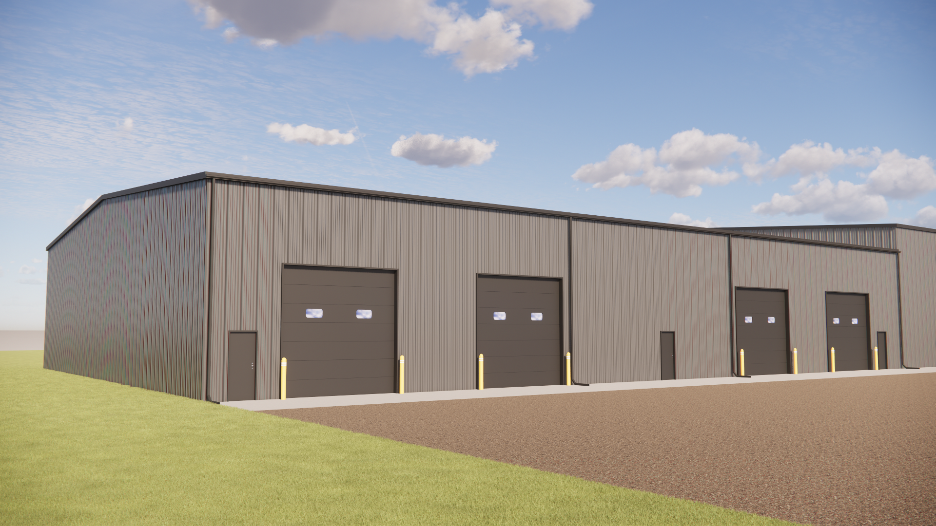 grey architectural steel siding black trim and doors gravel lot where shown show a few trees in the far distance don t change anything keep colors and everything how it is shown